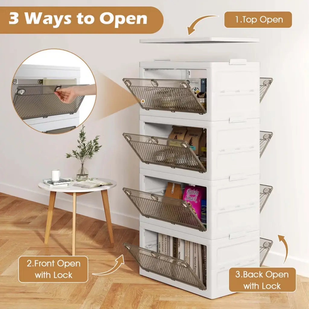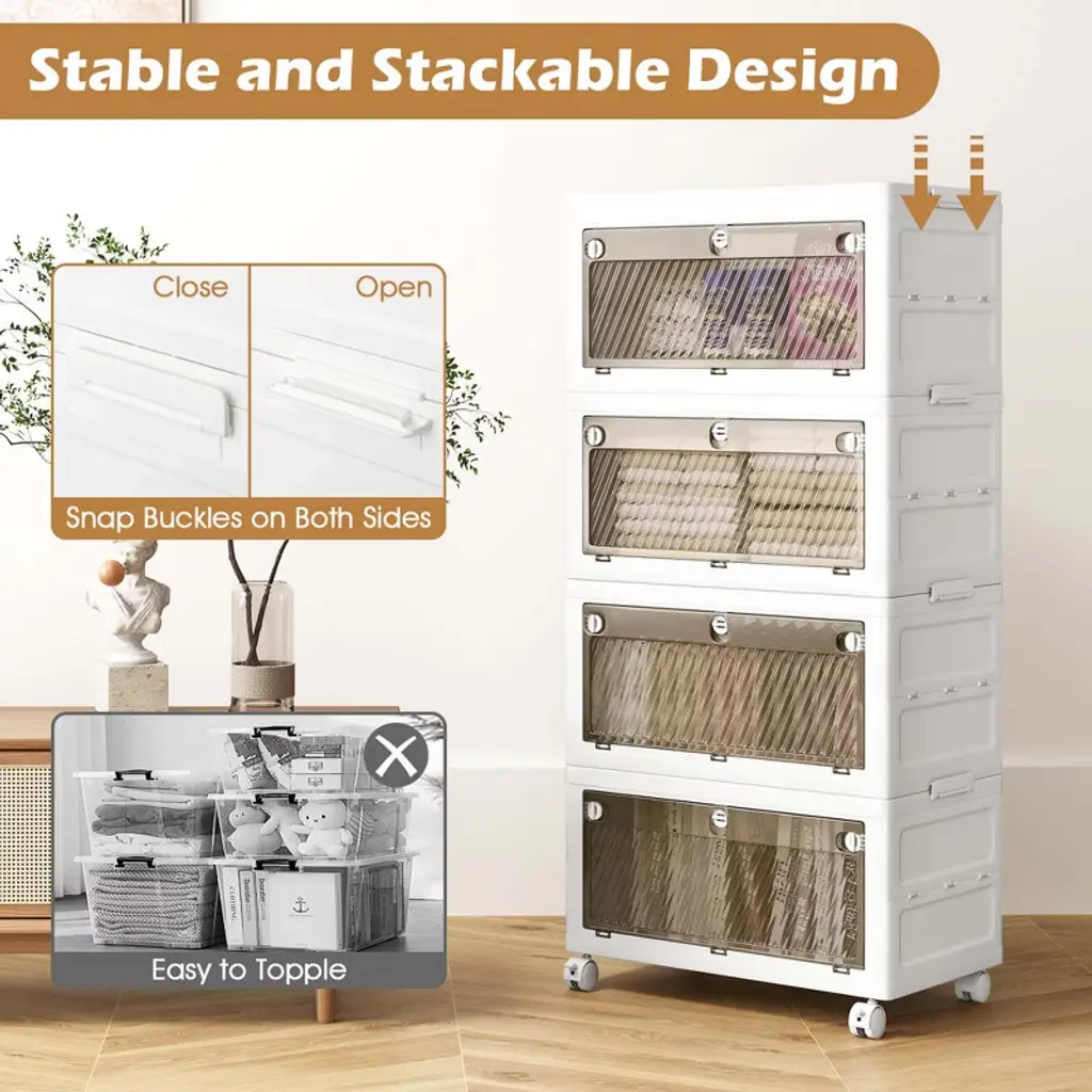 Discover the convenience of innovative storage with our stackable storage bins, designed to accommodate your dynamic storage needs while optimizing space. These storage bins boast a generous capacity of 33/44 gallons, making them suitable for housing a diverse array of items. From seasonal garments to assorted snacks, these containers handle a large variety of storage demands, helping maintain a tidy environment. Each bin includes a top lid and dual doors, providing triple access to contents, which makes item retrieval straightforward. The see-through doors, equipped with smooth sliding latches, offer a clear view of the stored items. For added practicality, each bin is equipped with four rolling casters for easy transportation. Featuring snap buckles on both sides, the bins can be easily connected or detached. Simple yet functional, the storage bins with drawers offer a practical addition to any home, enhancing the way you organize and access your wardrobe.FeaturesPre-connected parts and half-fold side panels for quick-fold assembly 33/44-gal generous capacity to accommodate a wide range of items 3 ways to open the drawer with top open, front open with lock, back open with lock 4 rolling casters make it simple to move them around 2 lockable casters ensures stability Snap buckles on both sides to quickly connect or disconnect the units Stackable design of the storage organizer is space-saving Suitable for the bedroom, cloakroom, clothing store, laundry room,kitchen, etc.Color: White + Brown Material: PP, HIPS Overall Dimensions: 21" x 13" x 35.5"/21" x 13" x 46" (L x W x H) Folding Dimensions: 21" x 13" x 10.5"/21" x 13" x 13" (L x W x H) Storage Capacity: 33/44 Gal Weight Capacity: 66/88 lbs Net Weight: 11/14.5 lbs Package Includes: 1 x Stackable Storage Bins 1 x User Manual