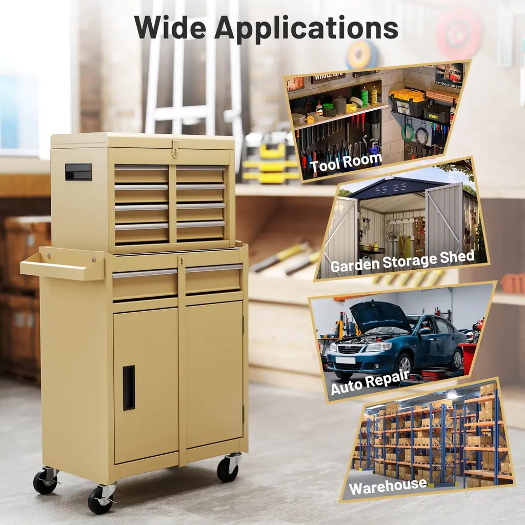 Upgrade your workspace organization with this 5-drawer rolling tool chest. Designed for both convenience and security, this tool storage cabinet features lockable wheels to keep your tools safe while allowing for easy mobility. The adjustable shelf ensures you can neatly organize any tool size and access them with ease. Plus, the removable tool box organizer provides even more customization options.This high-capacity tool chest is built to last with heavy-duty metal which is sturdy and rustproof. You can trust that with this well-designed rolling tool chest, all your tools are well classified and organized. Improve your efficiency with this must-have addition to your workspace! Feature2-in-1 detachable tool chest meets your different demands 5 drawers in total make your tools well-organized Locking buckle of lid and functional cut-out handle for more convenience Tool hanging board of bottom cabinet for additional storage space Inner shelf of bottom cabinet is removable and 3-level adjustable Easy to move with 4 universal wheels, 2 of which are lockable Side handle is also perfect to store tools Suitable for warehouse, workshop and tool roomSpecificationColor: Black/Red/Gray/Orange Material: Metal Overall Dimension: 23.5'' x 11'' x 40'' (L x W x H) Dimension of Upper Chest: 18'' x 9.5'' x 12.5'' (L x W x H) Dimension of Bottom Cabinet: 23.5'' x 11'' x 27.5'' (L x W x H) Net Weight: 38 lbs Weight Capacity of Each Drawer: 11 lbs Weight Capacity of Top Compartment: 11 lbs Weight Capacity of Bottom Cabinet's Countertop: 22 lbs Weight Capacity of Inner Middle Shelf: 11 lbs Weight Capacity of Inner Bottom Shelf: 22 lbs Total Weight Capacity: 122 lbs Package Includes: 1 x Upper Chest 1 x Bottom Cabinet 4 x Hooks 1 x Instruction