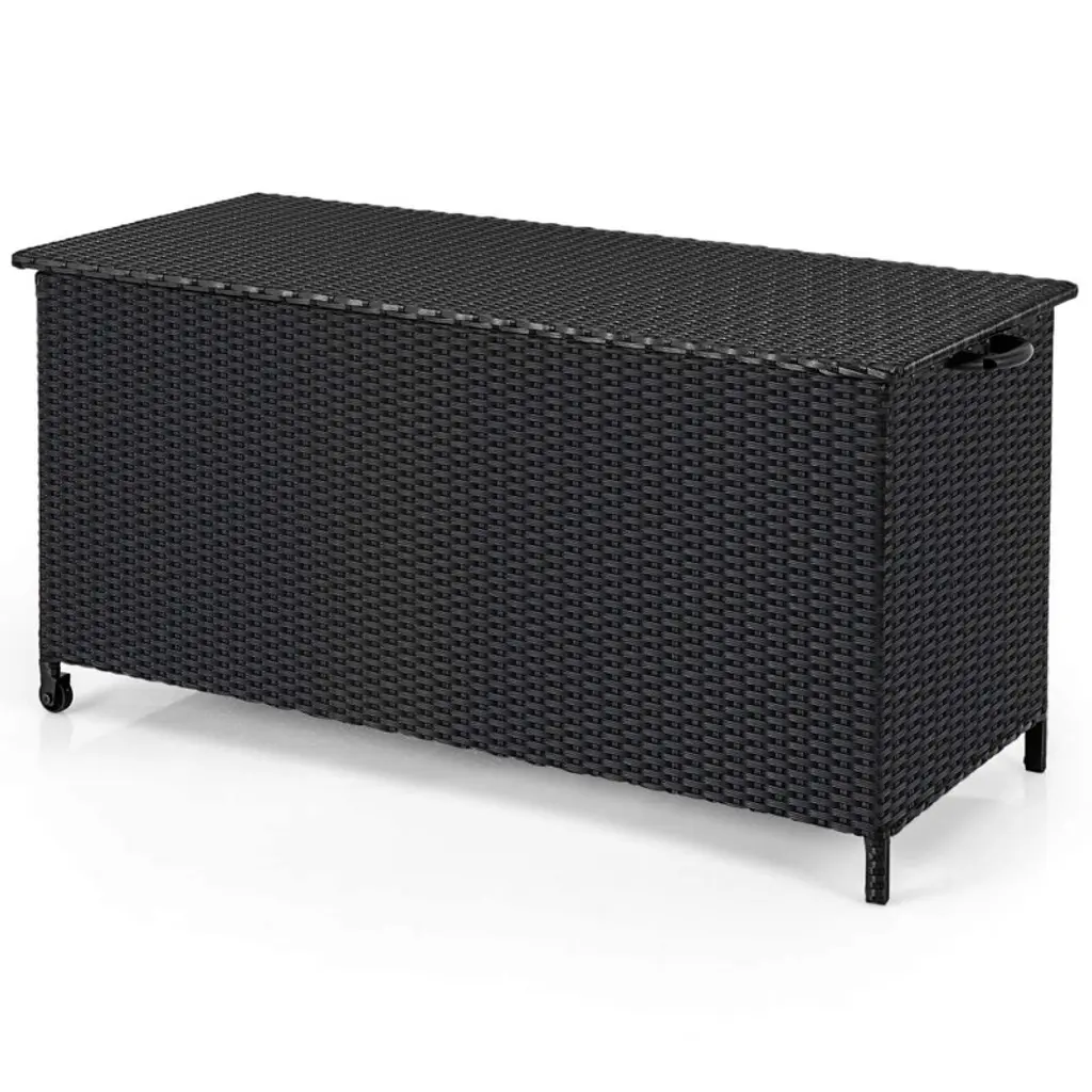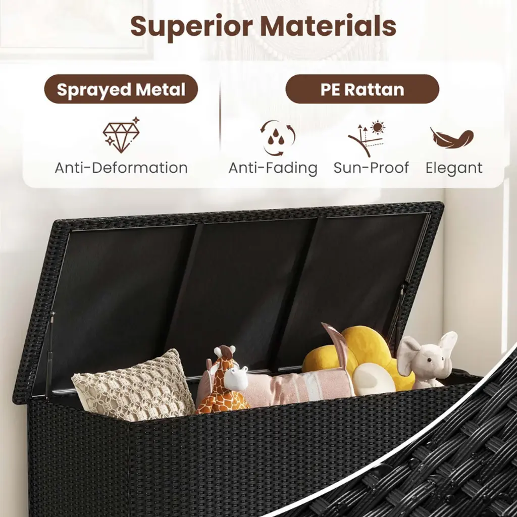 Costway 85 Gallon Rattan Deck Box With Waterproof Liner Universal Wheels & Gas Strut Black