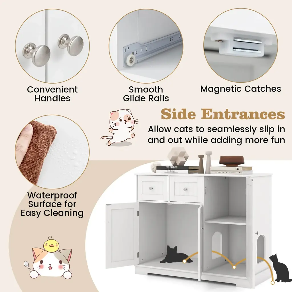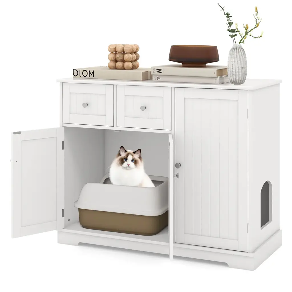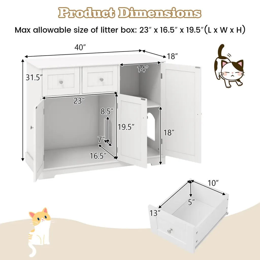 Create a Comfortable and Discreet Area for Your Lovely Furry Friends! Our cat litter box enclosure side table is the ultimate solution for cat owners seeking a blend of functionality and style in their homes. It includes an enclosed double-door cabinet for a cat litter box or a cat bed, offering a private sanctuary for cats. As a cat washroom, it could minimize odors and prevent litter from being tracked outside, ensuring a cleaner and more pleasant living environment. More than that, this cat cabinet comes with 2 drawers, 2 interior compartments, and a large countertop, providing plenty of room to store cat supplies, cat litter, ornaments, or books. Thus, it also functions as a side table, keeping items neatly organized and out of sight. Thanks to its 3 doors and waterproof surface, cleaning and maintenance are also a breeze. Besides, it is equipped with anti-toppling devices to safely secure the cabinet to the wall and a thickened base, ensuring the safety of both your cat and the furniture.FeatureServes as a discreet litter box cabinet, a stylish side table, and a cozy cat house The hidden area offers private space, reduces litter tracking and unpleasant smells Equipped with anti-toppling devices, the cabinet is built to be sturdy and stable Equipped with a 3" thickened base that provides robust support Comes with a large countertop to display decorations and hold often-used items Comes with 2 drawers and interior compartments to keep items neatly tucked away 2 side entrances allow cats to seamlessly slip in and out while adding more fun Features convenient door handles and magnetic catches, easy to open and close Features smooth glide rails, the drawers are effortless and silent to open Features double doors and waterproof surfaces for easy cleaningSpecificationColor: White Material: MDF Product Dimensions: 40" x 18" x 31.5" (L x W x H) Maximum allowable size of litter box: 23" x 16.5" x 19.5" (L x W x H) Weight Capacity of the Countertop: 44 lbs Weight Capacity of Each Drawer: 11 lbs Weight Capacity of the Bottom Cabinet: 44 lbs Net Weight: 64 lbs Package Includes: 1 x Cat Litter Box Enclosure 1 x User’s Manual
