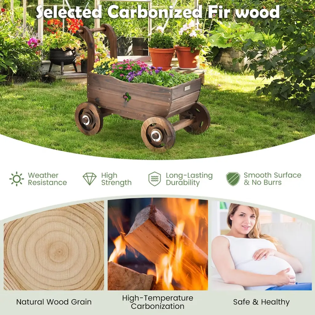 Add Charm & Beauty for Your Indoor & Outdoor Living Space! Our wooden wagon cart measures 27'' x 15'' x 21'' (L x W x H) and the planter box measures 19.5'' x 10.5'' x 6'' (L x W x H), providing enough space for cultivating flowers, herbs, vegetables, fruits, and more. It can not only be used as a garden planter, but also served as a decorative flower cart or a flowerpot stand. You can place some gifts or holiday decorations on it, making it a highlight of your living space. Furthermore, the wooden planter is crafted with selected carbonized fir wood, which is characterized by excellent weather resistance and good sturdiness, ensuring long-term use. Thanks to the drainage hole and gaps on the bottom, plants and roots would keep breathable. With the help of 4 wheels and an ergonomic handle, you can easily move the cart anywhere you want. Adopting a unique wagon shape and vintage appearance, this wooden planter box can perfectly blend into any indoor or outdoor decor. FeaturesCan be used as a decorative flower cart, a garden planter, or a flowerpot stand Can be used to cultivate plants, display potted plants or holiday decors With its vintage and elegant appearance, can be an attractive addition to your home The decorative hollowed patterns and wooden textured surface make it charming Crafted with premium carbonized fir wood, sturdy and sturdy, weatherproof The exquisite wooden surface is smooth and has no burrs, safe to use The bottom drainage hole ensures good water drainage and well ventilation The wooden handles and wheels allow you to easily move the cart around The reinforced wood bars and sturdy screw connection make it stable and solidColor: Brown Material: Fir Wood Overall Dimensions: 27'' x 15'' x 21'' (L x W x H) Size of the Planting Box: 19.5'' x 10.5'' x 6'' (L x W x H) Diameter of the Wheel: 6.5'' Weight Capacity: 44 lbs Net Weight: 8 lbs Package Includes: 1 x Wooden Wagon Cart 1 x User’s Manual