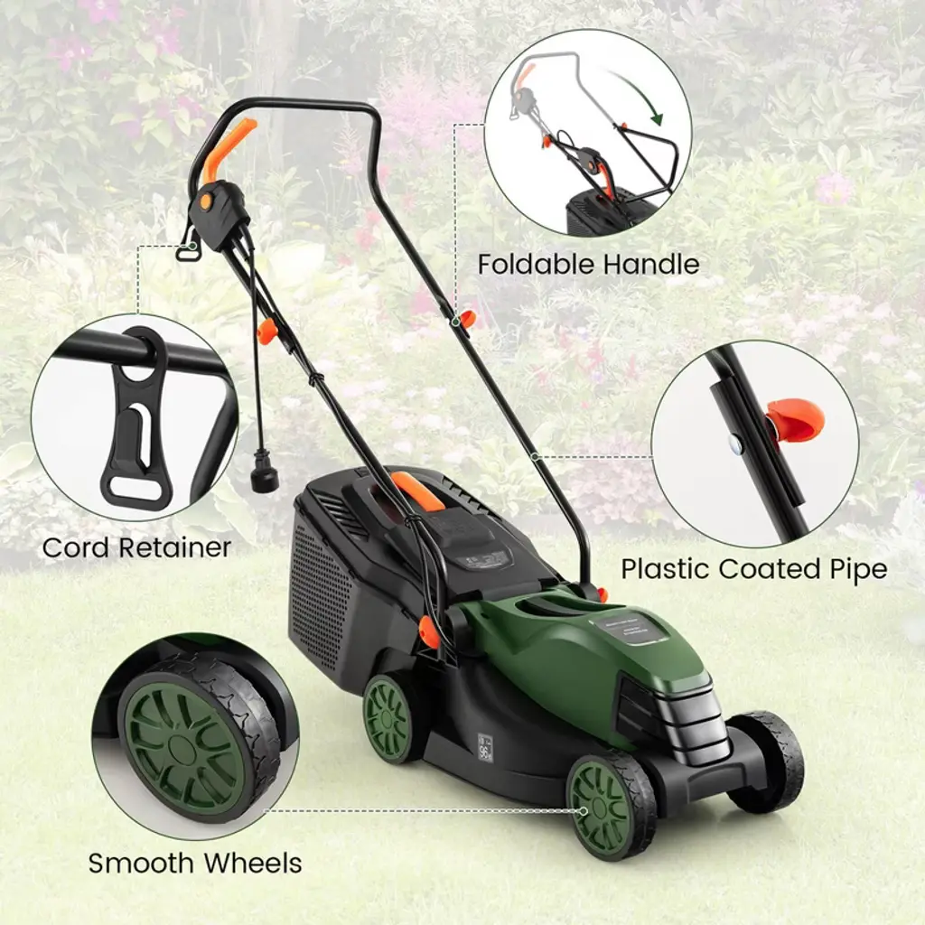 Tired of the weeds in your front yard but don't know what to do? Try our powerful weed mower now! Equipped with wide 14 inch cutting blade and 3800 rpm powerful motor, you can clean your yard with high efficiency. Not to mention the 3 position free adjustment system, allows you to cut the glass of 1'', 1.8'' and 2.5'' height. Meanwhile, the light weight body part and 5 inch wheels offer smooth movement through the grass. Apart from that, this grass cutting machine provide both safe electronic start and self locking function for your safety. This space saving folding mower will be a great assistant to your life!Features3 position adjustment of 1'', 1.8'' and 2.5'' Equipped with foldable handle for easy storage The safe electronic start add extra safety for user The 1500W power motor operates stably at 110V voltage 14-inch cutting width of the lawn mower assures quicker mowing Fitted with 35L collection box to store grass clippings With folding handle, the mower can be fold down to compact sizeColor:Black, Green Material: PP, Metal Product Dimension: 44.5'' x 17.5'' x 40'' (L x W x H) Product Dimension after Folding: 37.5'' x 17.5'' x 26.5'' (L x W x H) Net Weight:15.5 lbs Cutting Height: 1''/ 1.8''/ 2.5'' Cutting Width: 14'' Rated Power: 12A/ 1500W Voltage: 110V 60Hz Idling Speed: 3800 rpm Capacity of Collection Box: 35L Package Includes: 1 X Lawn Mower 1 X User Guide