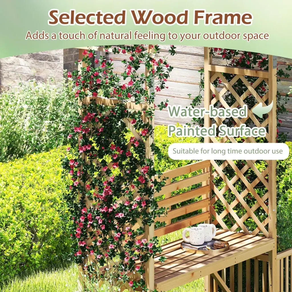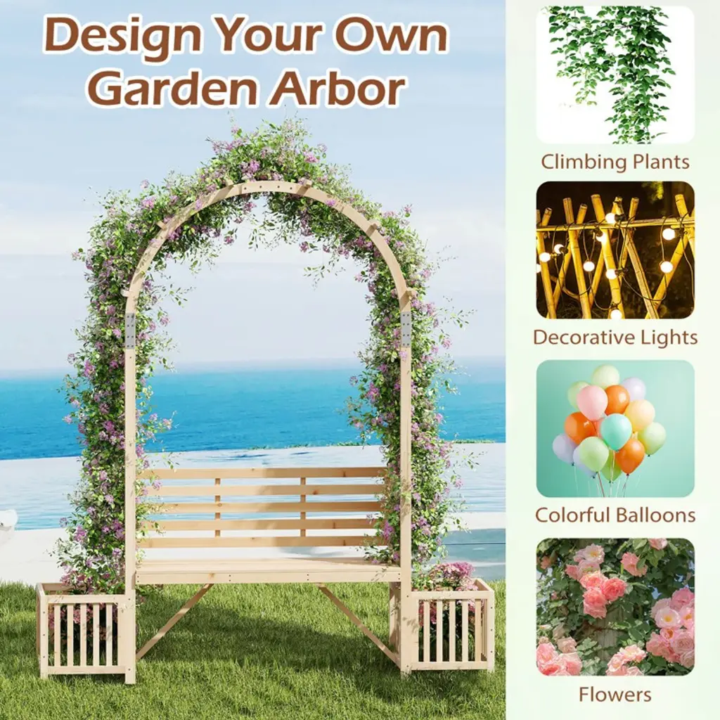 Are you looking for a versatile garden arbor that combines both aesthetics and functionality? Our arc top bench trellis is the perfect choice for you. With ample planting space, including 6 crossbars on the top and 2 side planting boxes and side climbing trellises, it provides abundant room for your climbing plants to flourish. The 2-seat wooden bench offers a wide seat and a comfortable backrest, supporting up to 660 lbs, making this wooden bench arbor arch an ideal spot for you to unwind with a good book or chat with friends. Additionally, you can also enjoy multiple decorating options, such as wrapping decorative lights, displaying colorful balloons and flowers, to create a perfect backdrop for outdoor events, like backyards, patios, or community gardens.FeaturesProvides ample planting space with 6 crossbars on the top for climbing plants Features 2 side planting boxes and climbing trellises for more growing room Offers a 2-seat wooden bench with a wide seat and comfy backrest Supports up to 660 lbs, accommodating 2 people comfortably Made from selected fir wood with natural grain and texture Water-based paint treatment resists cracking and ensures longevity Allows decorating options like wrapping lights or displaying balloons, flowers Boasts a stable triangular structure and reinforced connectors Suits various settings such as backyards, patios, or community gardensColor: Nature Material: Fir Wood Overall Dimensions: 73" x 22" x 80" (L x W x H) Seat Dimensions: 43" x 16" (L x W) Planter Dimensions: 17" x 14" x 14" (L x W) Net Weight: 33 lbs Load Capacity of Bench: 660 lbs Package Includes: 1 x Bench Arbor Arch 1 x User Guide