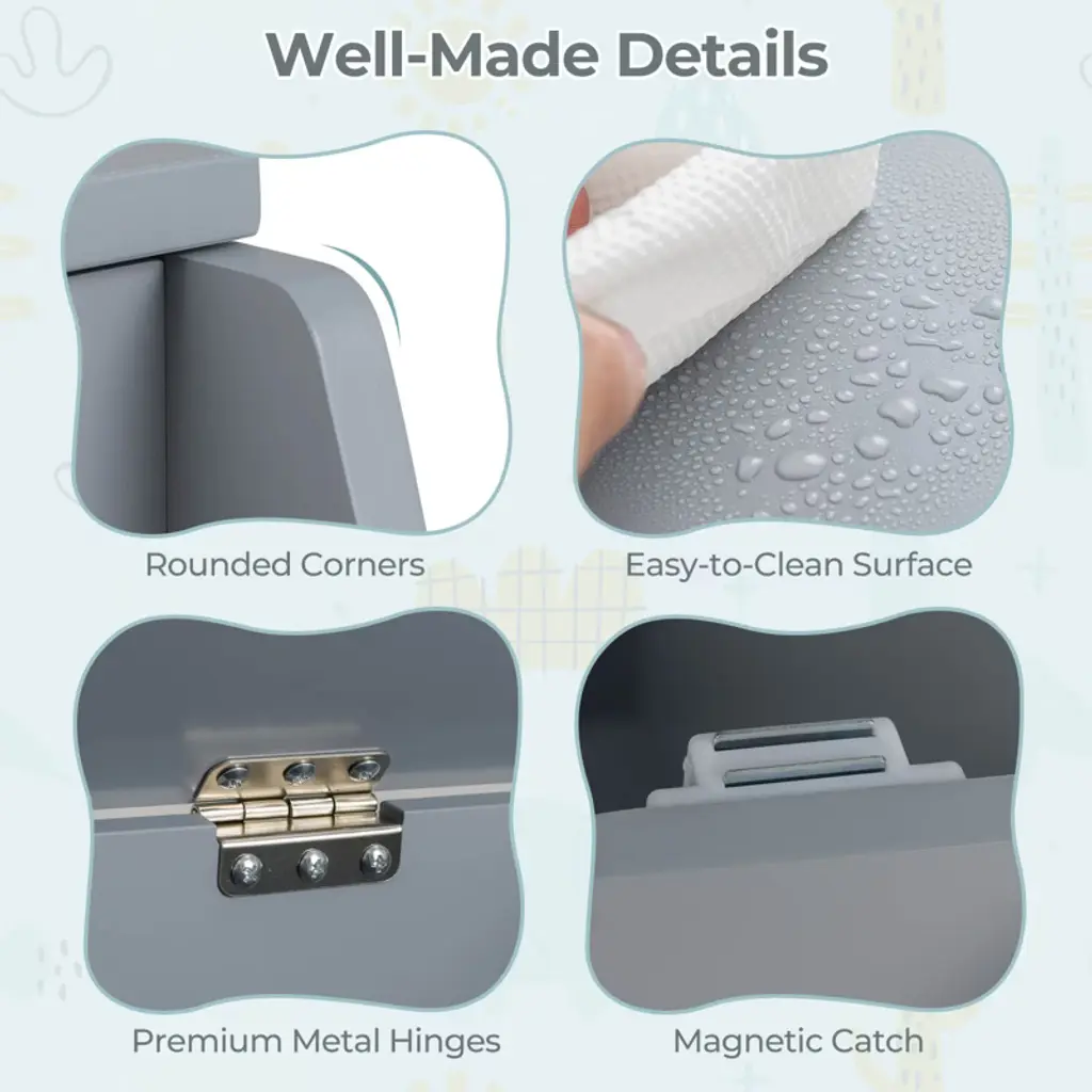 Effectively classify and organize children's toys with our rolling toy storage chest! Featuring 2 storage compartments, this toy box can accommodate and display children's toys, books, stuffed animals, sports gear, craft supplies, clothes and more. It will keep your child's bedroom in order and help him/her develop good storage habits. This mobile storage organizer is equipped with a flip-top lid to keep toys or other items out of sight and protect them from dust. Plus, the soft-closing gas strut prevents the lid from dropping and avoids abrupt closure to pinch your child's hand. Moreover, 4 360° rotation wheels (2 lockable) allow easy moving for little kids. With the simple white finish and practical design, this toy storage chest is a perfect addition to kids room, playroom, living room, nursery and more. FeaturesLarge storage space for toys, books, sports gear, craft supplies, etc. Front bookshelf offers additional storage space and easy access, front baffle can prevent items from falling Can be used as a toy box, bookcase, bench, bed stool, etc. 4 universal wheels make it easy to move around 2 wheels with brakes to lock the cabinet into place if needed Humanized cut-out design helps open the lid easily Flip-top lid with soft-closing gas strut avoids any potential danger Premium and thick MDF ensures great stability and long lasting use Elegant and simple design is suitable for various home decoration styles Kid-friendly material, round corners and smooth edges make it safe for kids to use Painted surface is anti-scratch, smooth to touch and easy to clean Easy to put together with detailed instructionColor: Gray/White Material: MDF, PP Overall Dimension: 24" x 19" x 18"(L x W x H) Weight Capacity of Top: 110 lbs Weight Capacity of Inside: 66 lbs Net Weight: 27 lbs Package Includes: 1 x Toy Storage Box with Wheels 1 x Instruction