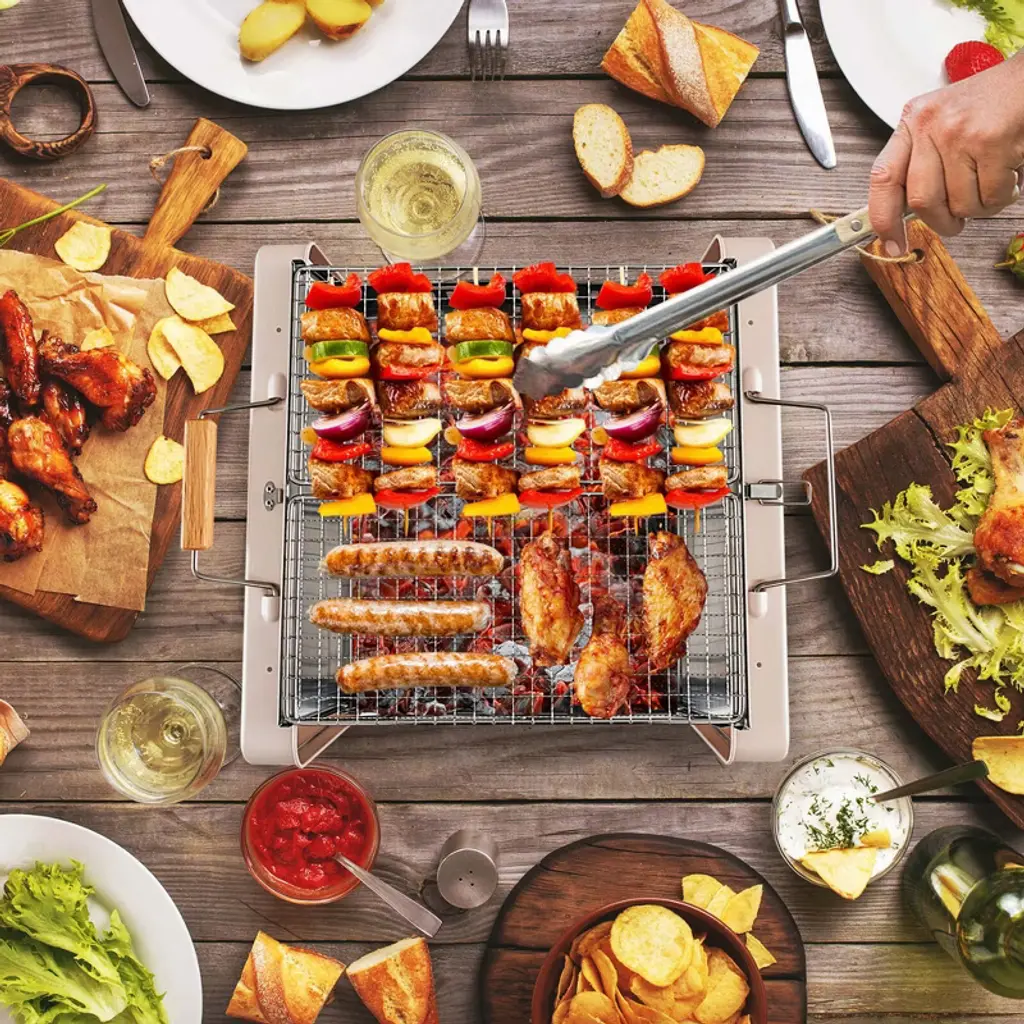 Delight in delicious and smoky flavors with our BBQ grill. Perfect for campers and grill lovers, our outdoor charcoal grill combines portability with exceptional cooking capabilities. This lightweight grill with a rubber wood handle can be folded into a compact size, just like a mini suitcase, making it easy to carry. Safety is prioritized with the insulated handle and sturdy metal clasps, ensuring a fun barbecue experience anywhere. Moreover, the charcoal grill features a generous cooking area with 2 stainless steel grill nets and a dependable charcoal box with air vents for even and efficient heat. The dishwasher-safe grill nets allow different foods to be grilled at the same time, so you can enjoy a harvest meal.FeaturesPortable carry-on design is easy to carry around Large cooking area for different foods Air vents promote complete combustion of charcoal 2 grill nets made of premium stainless steel are dishwasher-safe Easy to fold up for added convenience Designed with a perfect size for the trunk Insulated rubber wood handle makes it easy to carry and move Metal locking clasps prevent the suitcase from opening Non-slip pads play a very good stabilizing role Suitable for a picnic, camping, BBQ party, and travel Can be quickly set up to enjoy BBQs immediatelyColor: Beige + Silver Material: Stainless Steel, Rubber Wood, Carbon Steel Product Dimension: 15" x 15" x 10"(L x W x H) Folding Dimensions: 15" x 3.5" x 12"(L x W x H) Size of Each Grill Gird: 12" x 6.5"(L x W) Size of the Frame: 15" x 8.5"(L x W) Side Height of Body: 9.5" Net Weight: 5.5 lbs Package Includes: 1 x Portable Charcoal Grill 2 x Grill Grids 1 x Frame 1 x User Manual
