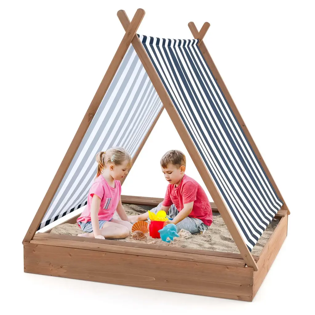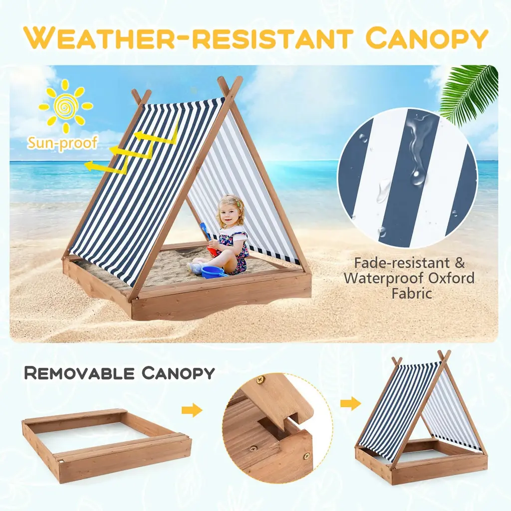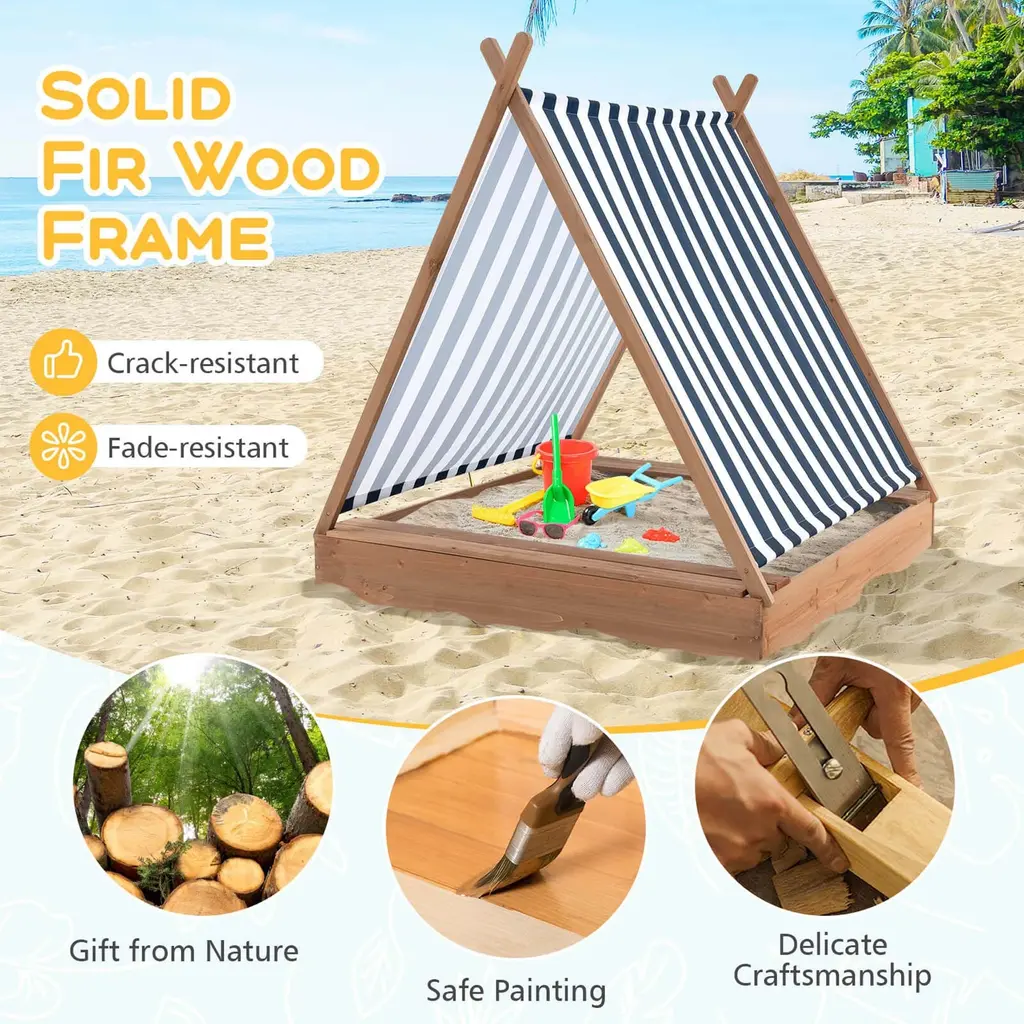 Costway Wooden Sandbox With Canopy Tent Design Fir Wood Frame 2 Bench - See Details - Natural - See Details