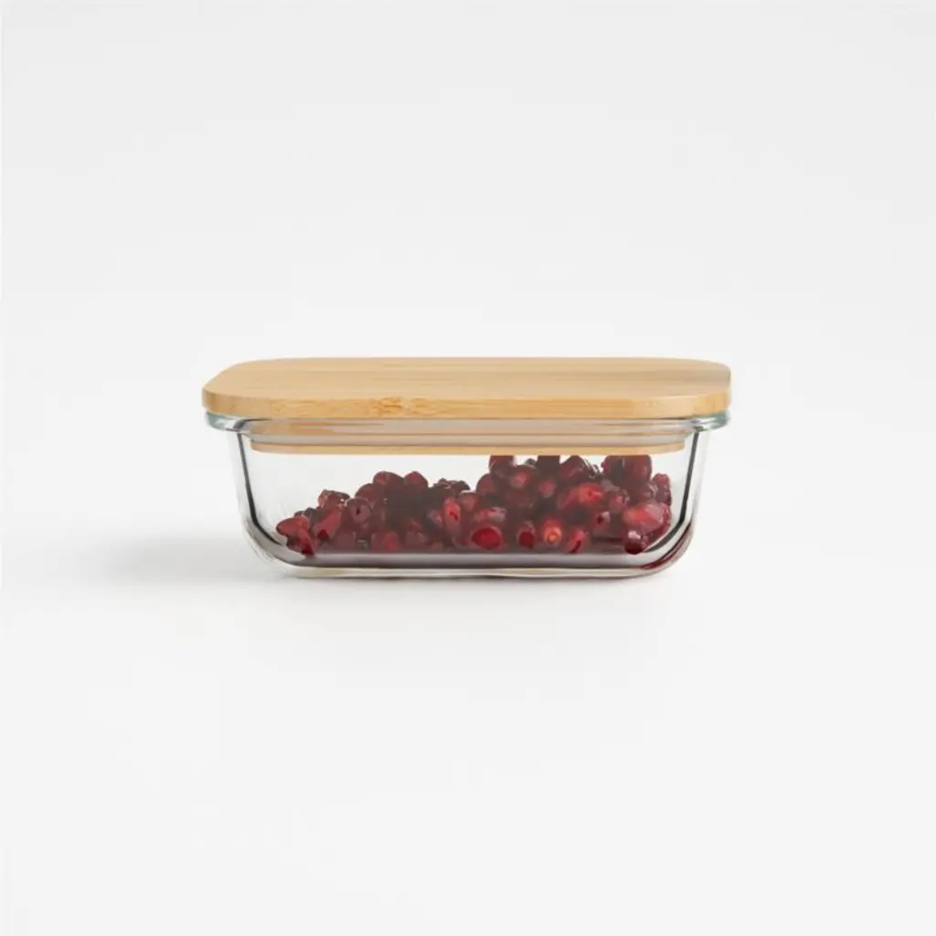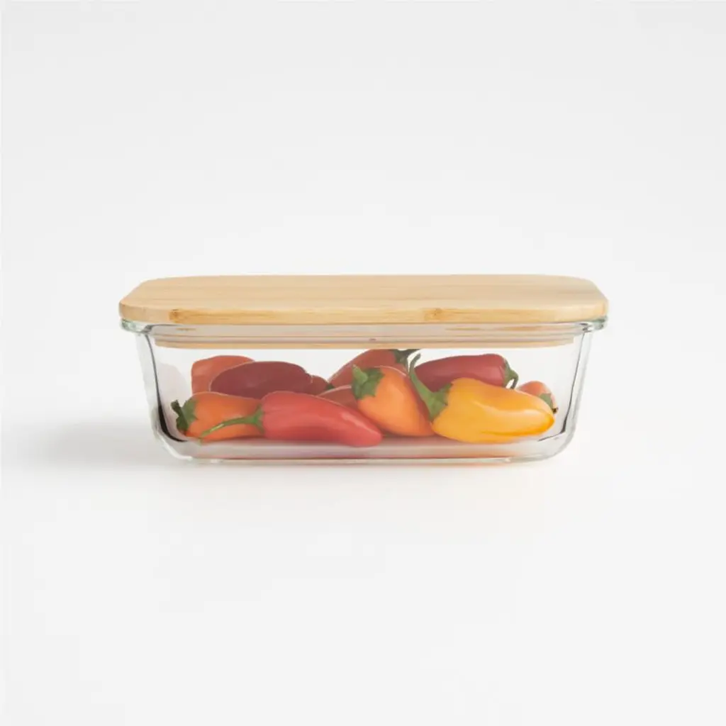 Beautify and organize leftovers, snacks and essential ingredients in our bamboo-topped glass storage containers. Fitted with silicone gaskets, the durable borosilicate glass containers close securely with an airtight seal. Golden bamboo contrasts with the clear glass below for a modern organic look in the refrigerator, in a cabinet or on your desk. With a seven-cup capacity, the rectangular storage containers can be used to heat up lunches and leftovers in the microwave or oven and clean up easily in the dishwasher.