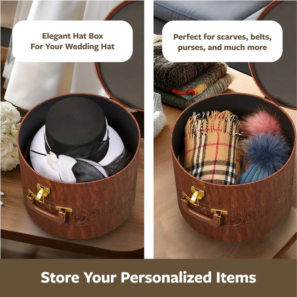 DISPLAY THEM: These Multi-Functional Storage Boxes Look Elegant on Display with The Nice Design on The Box & Lid Together with The Sturdy Gold Lock and Handle Which Gives It an Upscale Modern Look.QUALITY: This Hard Hat Box Is Made of A Hard Material And High-Quality PVC leather So Your Hats Will Stay In Great Shape Even In Hot Summer, Rainy, Windy, And Snow WethersSTORAGE: You Can Store Any Travel Luggage on Top as The Hat Box Without Worrying the Hats Will Get Squeezed or Misshapen.GREAT AS GIFTS OR PHOTOGRAPHY PROPS: This Decorative Box Is Perfect for A Wedding Shower Gift, To Hold A Birthday Cake or Gift for A Daughter, Mother, Grandmother or Friend.SIZE: We Offer a Variety of Sizes to Accommodate Different Hat Styles. Choose The Hat Box Size That Best Protects Your Hats.