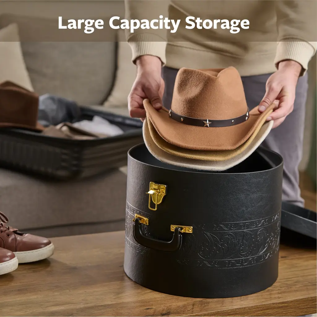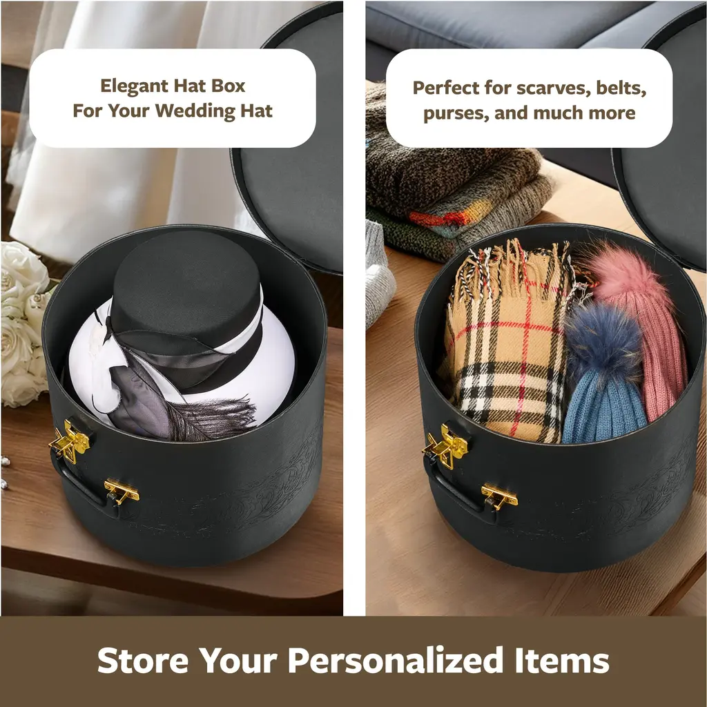 DISPLAY THEM: These Multi-Functional Storage Boxes Look Elegant on Display with The Nice Design on The Box & Lid Together with The Sturdy Gold Lock and Handle Which Gives It an Upscale Modern Look.QUALITY: This Hard Hat Box Is Made of A Hard Material And High-Quality PVC leather So Your Hats Will Stay In Great Shape Even In Hot Summer, Rainy, Windy, And Snow WethersSTORAGE: You Can Store Any Travel Luggage on Top as The Hat Box Without Worrying the Hats Will Get Squeezed or Misshapen.GREAT AS GIFTS OR PHOTOGRAPHY PROPS: This Decorative Box Is Perfect for A Wedding Shower Gift, To Hold A Birthday Cake or Gift for A Daughter, Mother, Grandmother or Friend.SIZE: We Offer a Variety of Sizes to Accommodate Different Hat Styles. Choose The Hat Box Size That Best Protects Your Hats.
