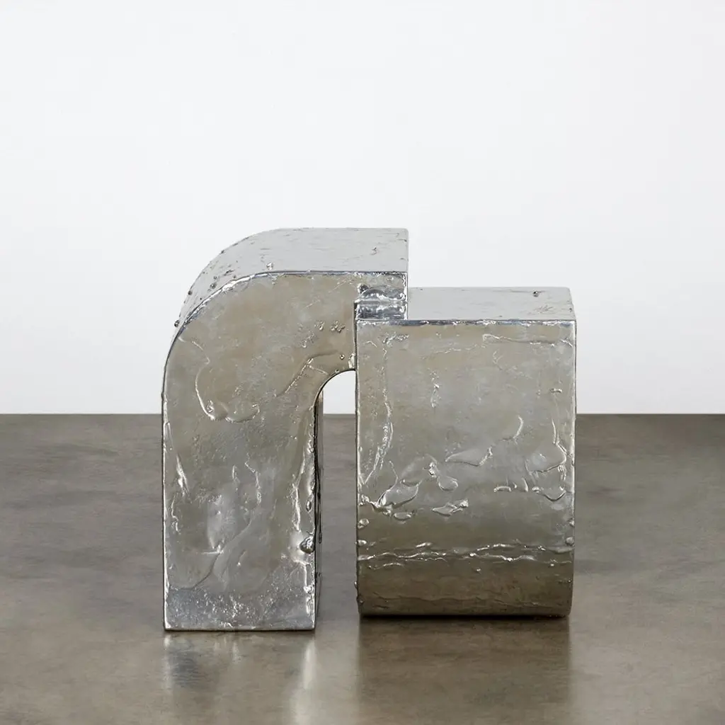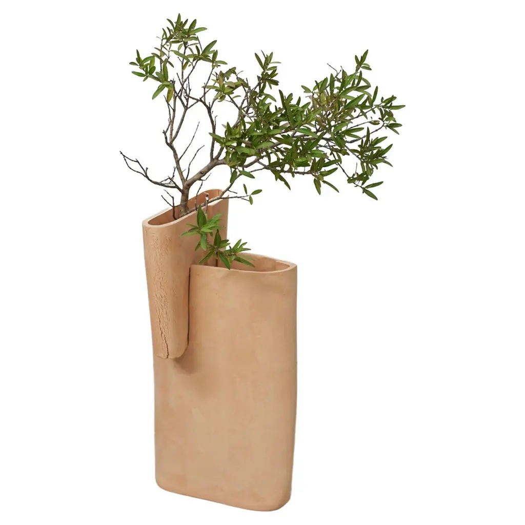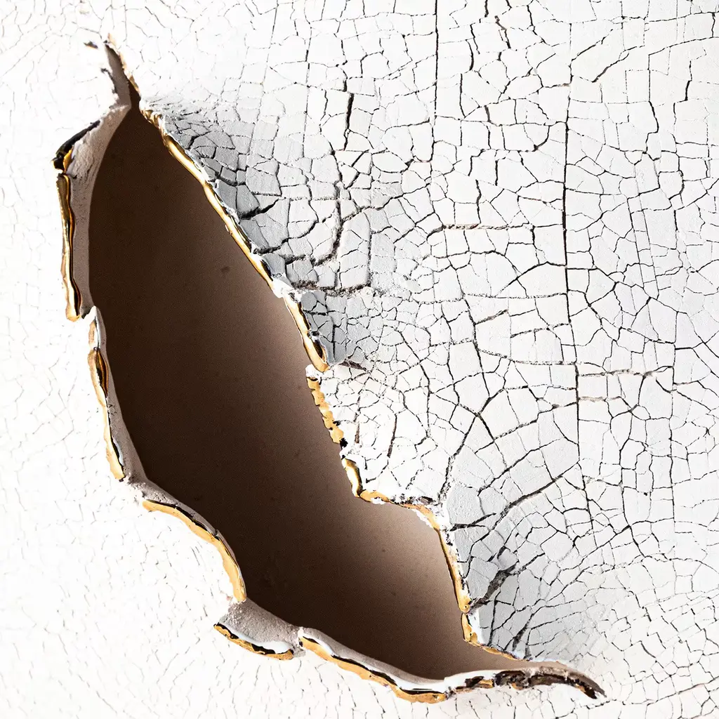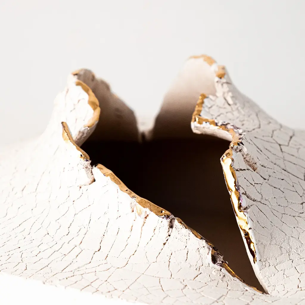 A breathtaking work of art, this ceramic sculpture belongs to the Cretto Collection. Inspired by the Earth's natural fissures ("cretto" in Italian), this container showcases a parallelepiped shape with a finished with a white enamel glaze whose surface has been glazed with sodium silicate and fired to create an extraordinary grainy and cracked texture. Its magnificent volcanic fissure is enhanced by gold luster detail.