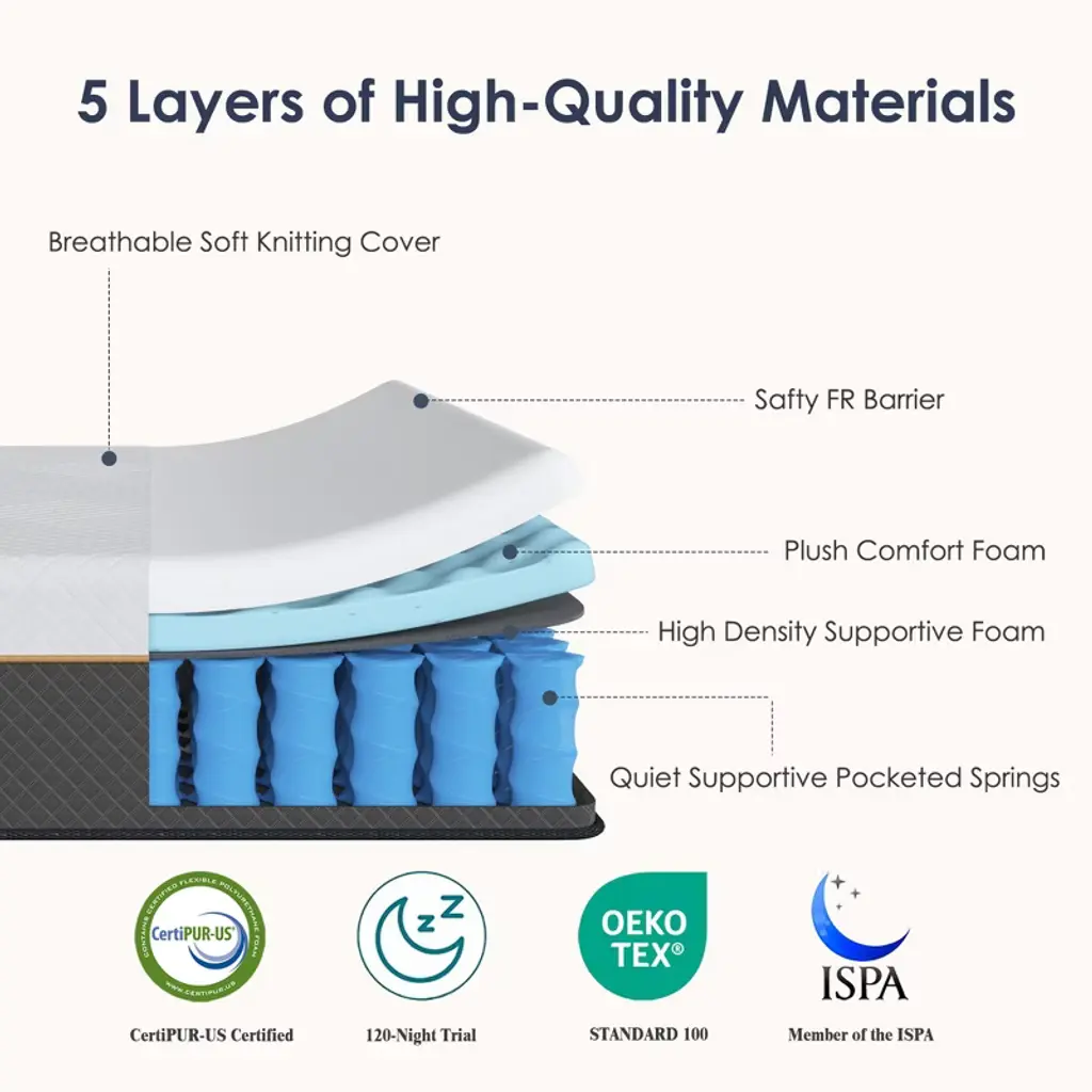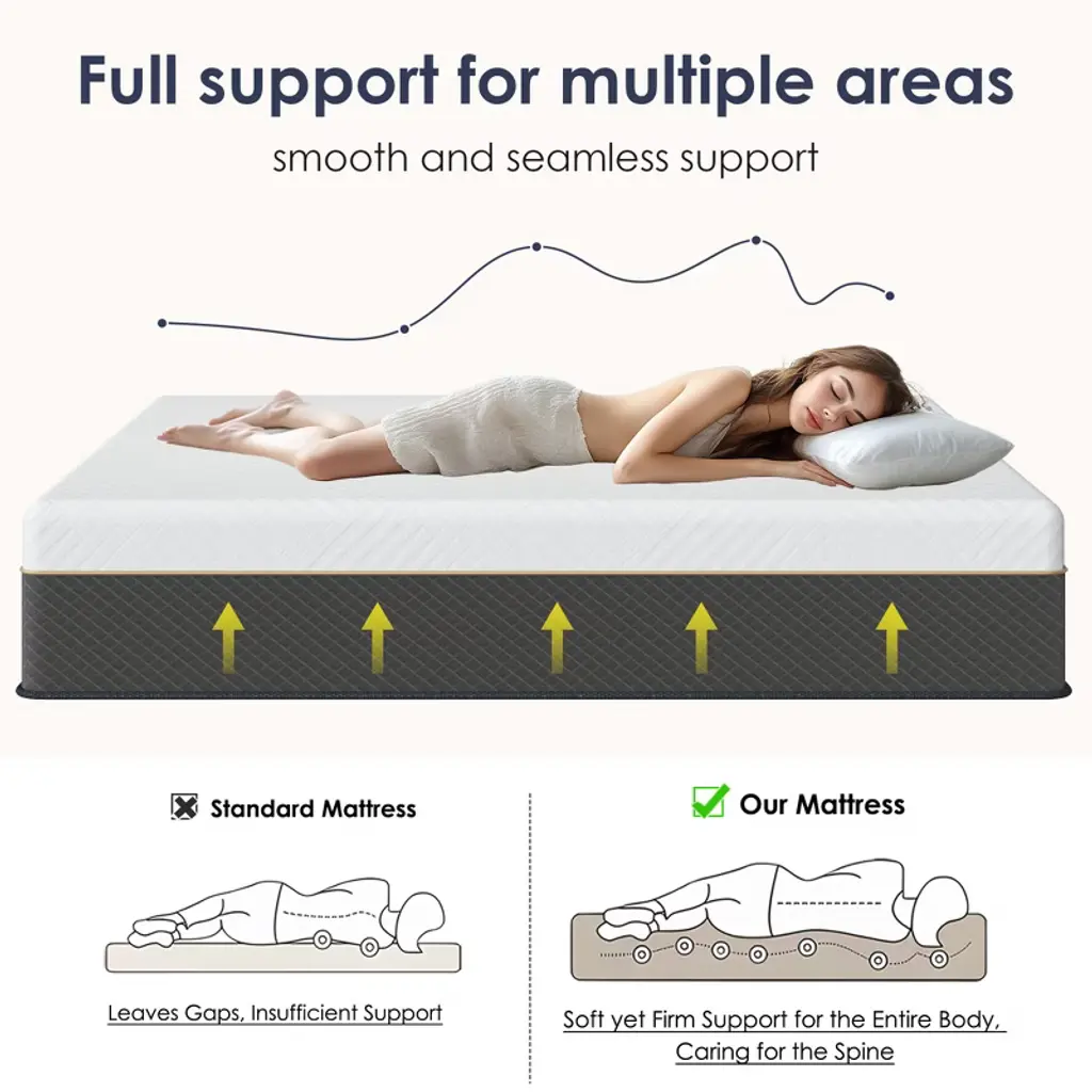 Dream In Comfort, Wake In Bliss: With its ergonomic design, this Hybrid mattress provides exceptional support by conforming to the natural curves of your body. The comfort foam layer adapts to your body's shape in every position to provide a whole night of comfortable sleep. Top cover adopts breathable and moisture-absorbing knit fabric, allowing the mattress to breathe freely, promoting a dry and rejuvenating sleep experience.