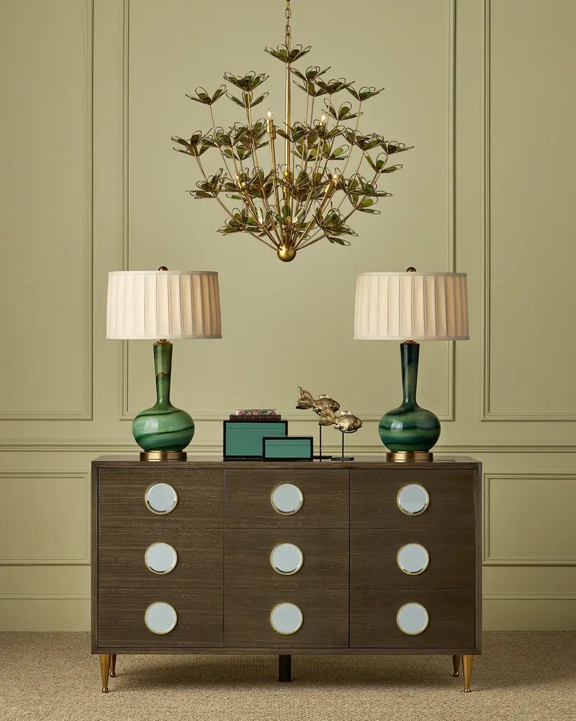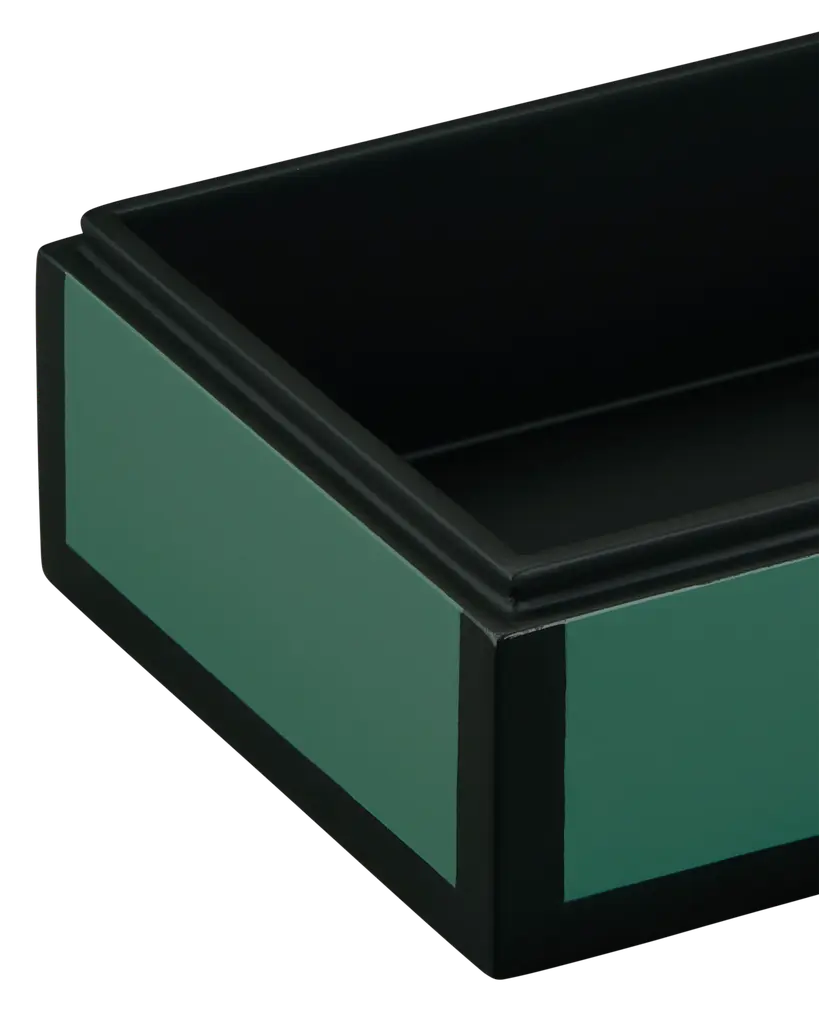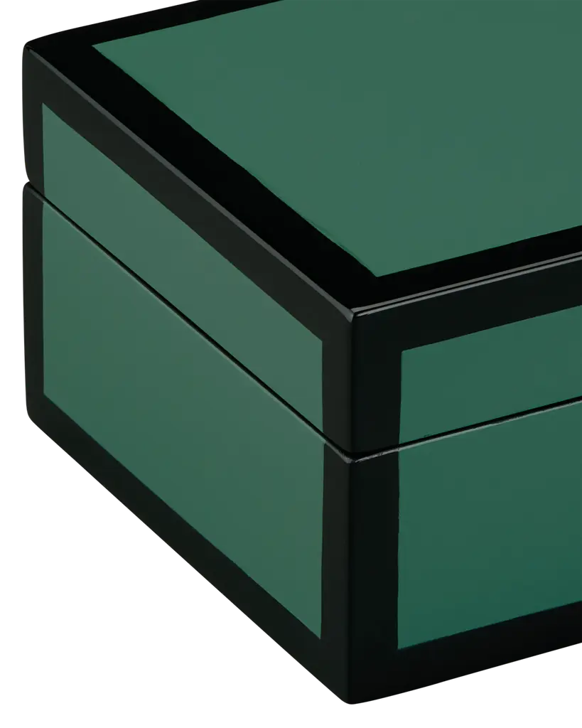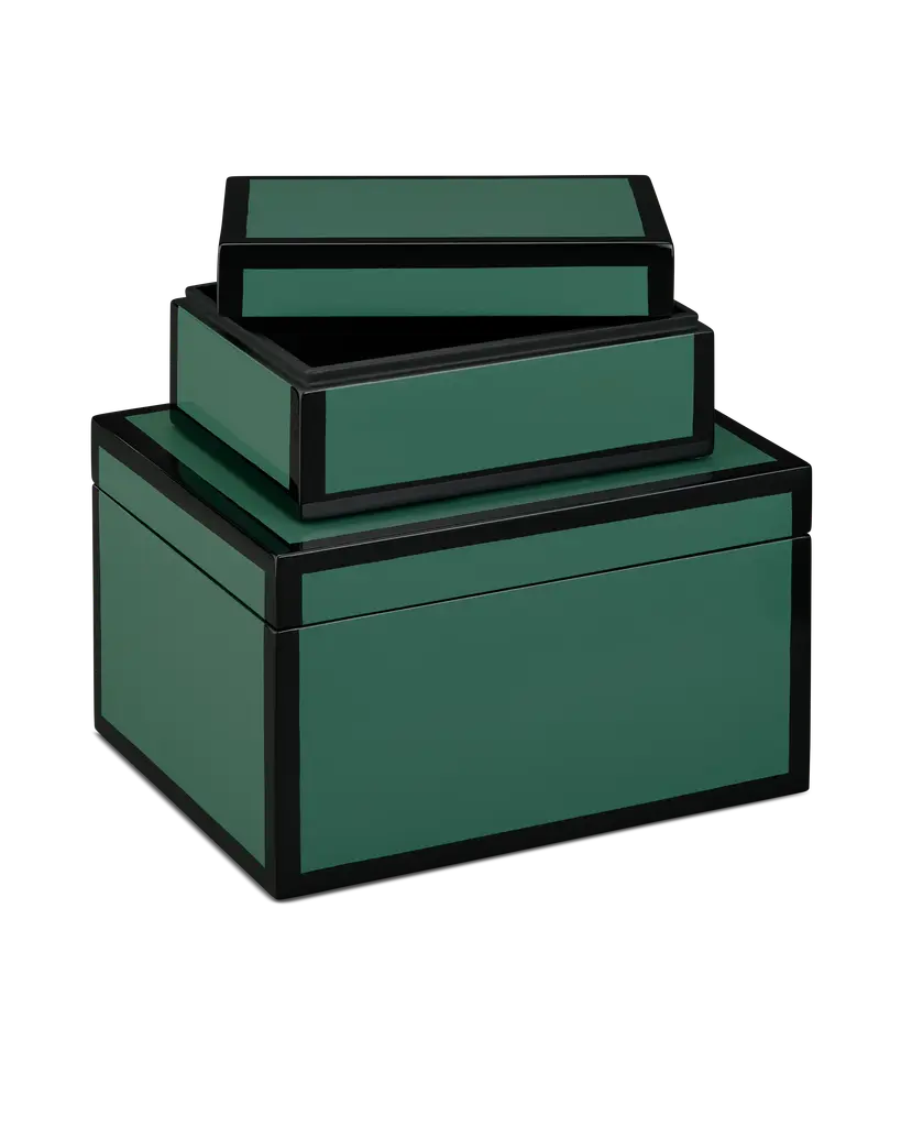 Nothing beats the sheen of lacquer where decorative boxes are concerned, as is evident in the sleek surfaces of the Green Lacquer Box Set. Made of wood, the pair of boxes have been covered in the time-honored process that has been valued in interior design for so long. The glossy green surfaces are rimmed in rich black, and the interiors are in a matte black finish. The pair of green boxes is made to nest or to stand separately. Wipe clean with a soft, dry cloth or static duster. Always avoid the use of harsh chemicals or abrasive cleaners as they may cause damage to the item's finish. Due to the use of natural materials, handmade craftsmanship, or hand finishing, expect some color variances. Hand crafted pieces may have slight size differences.