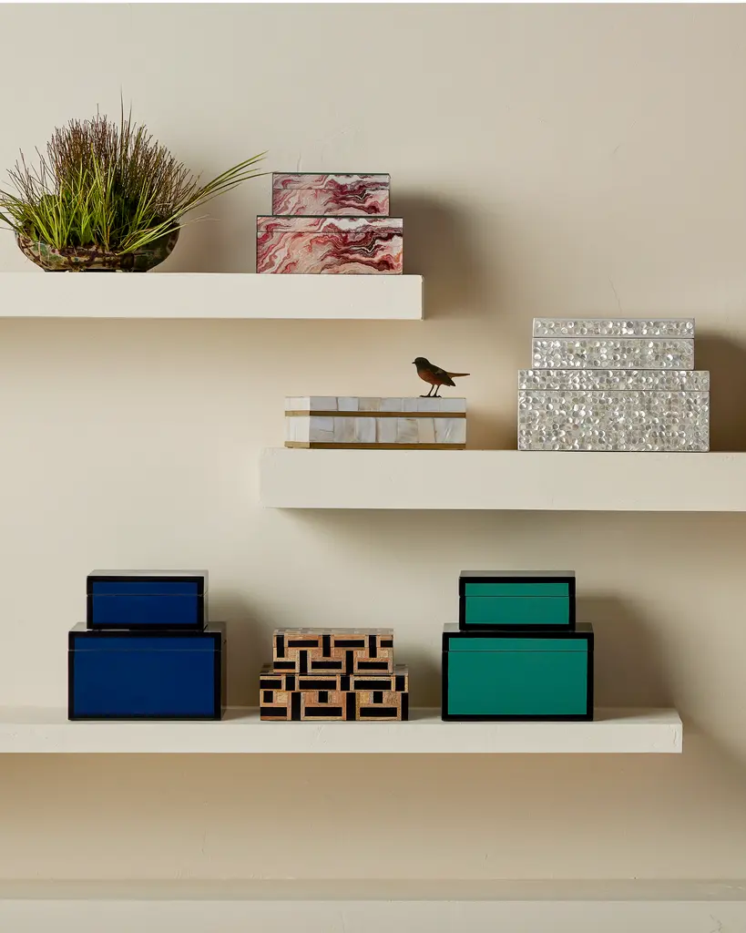 Nothing beats the sheen of lacquer where decorative boxes are concerned, as is evident in the sleek surfaces of the Navy Lacquer Box Set. Made of wood, the pair of boxes have been covered in the time-honored process that has been valued in interior design for so long. The glossy navy surfaces are rimmed in rich black, and the interiors are in a matte black finish. The pair of blue boxes are made to nest. Wipe clean with a soft, dry cloth or static duster. Always avoid the use of harsh chemicals or abrasive cleaners as they may cause damage to the item's finish. Due to the use of natural materials, handmade craftsmanship, or hand finishing, expect some color variances. Hand crafted pieces may have slight size differences.