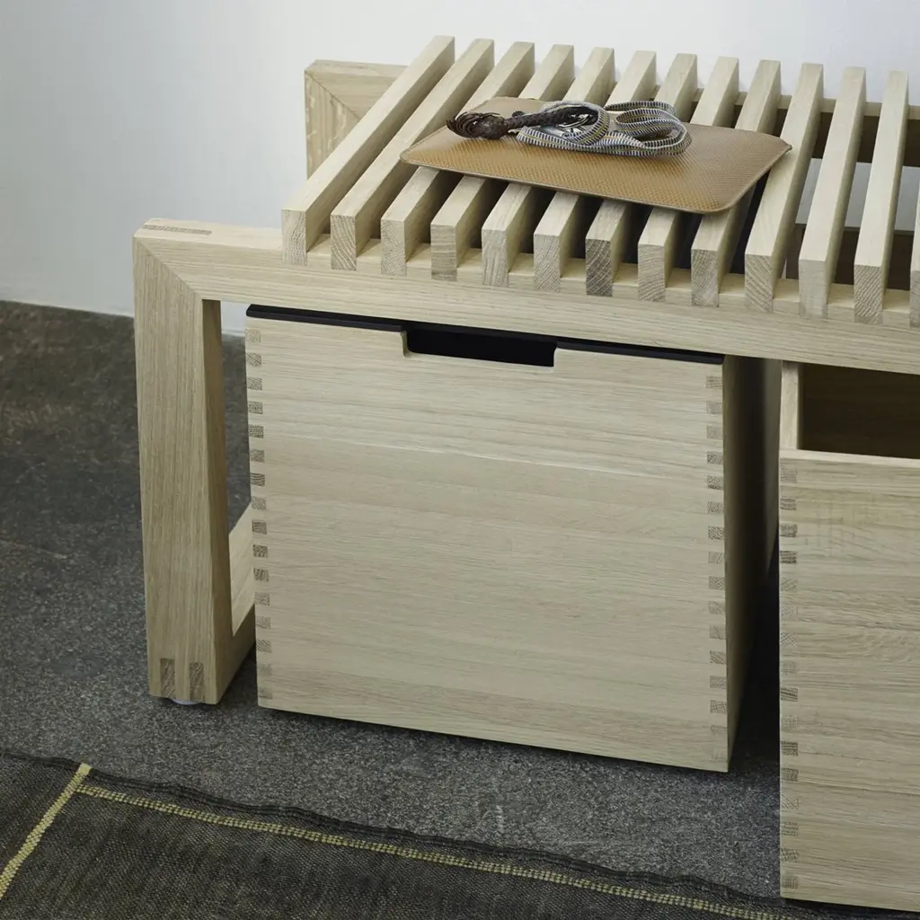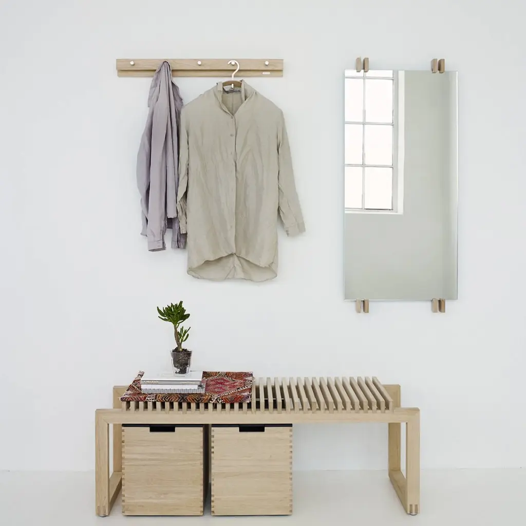Niels Hvass‘s Cutter range includes design-worthy wooden storage boxes. The larger version has tiny wheels that make it easy to move around on the floor and it’s sized to stow under the collection’s bench and stool. The grooves under the small box make it fit perfectly on top of the planked wardrobe shelf. Either one stylishly keeps items in easy reach, whether it’s gloves and scarves, sporting equipment or kiddie toys and games.
