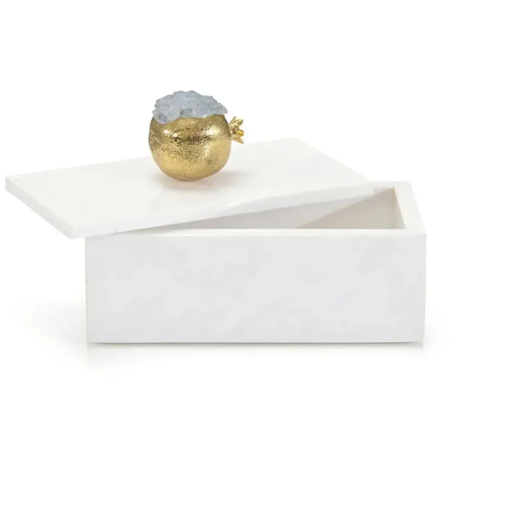 A white marble box enhanced with a cyanite pomegranate accent mounted on the lid for an elegant addition to any space.