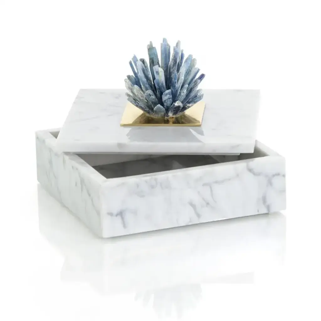 This stunning decorative box features a gorgeous formation of natural cyanite crystals that merge into a starburst pattern. The formation of stones is gently perched atop a square box of white marble separated by a thin plate of polished brass, creating a lovely juxtaposition between shiny metallics and rugged stone. Possessing a wealth of dynamic texture, the Cyanite Starburst on Marble Box is a wonderful accent piece to elevate the look and feel of an interior space.