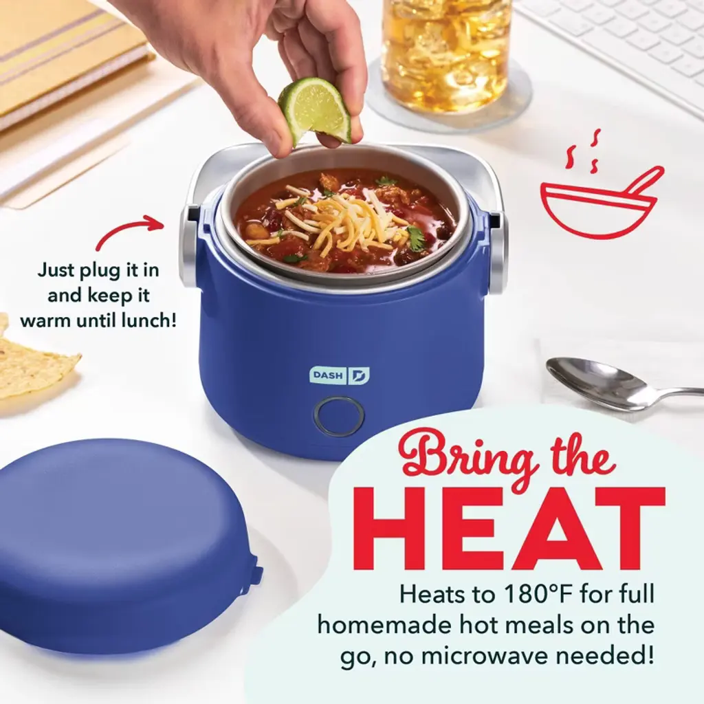 Romance Copy: Bring the heat with the Dash Hot2Go™ Portable Food Warmer. Take your favorite meals with you wherever you go, plug in to begin heating, and then it’s ready to eat when you’re hungry! Food is ready to eat in about 45 minutes after you plug in, perfect for the office, dorms, or anywhere else you want a homemade hot meal. Skip the cost of take out and the office microwave line and choose your own ingredients for a lunch that’s healthy & homemade, then take what you make! With a 20-ounce capacity, it fits one large soup can, plus it’s great for leftovers, oatmeal, mac & cheese, & more. An easy-carry handle and detachable Power Cord make for maximum portability while the spill-proof Locking Lid keeps everything mess-free while you’re on the go. Craving some fresh lunch ideas? Check out the included Recipe Guide for easy heating and tasty eating with Hot2Go™!