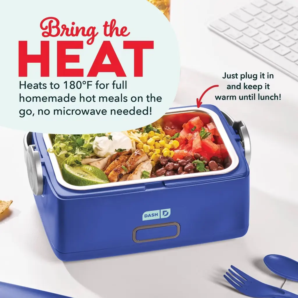 Romance Copy: Bring the heat with the Dash Hot2Go™ Portable Food Warmer. Take your favorite meals with you wherever you go, plug in to begin heating, and then it’s ready to eat when you’re hungry! Food is ready to eat about 45 minutes after you plug in, perfect for the office, dorms, or anywhere else you want a homemade hot meal. Skip the cost of take out and the office microwave line and choose your own ingredients for a lunch that’s healthy & homemade, then take what you make! With a 30-ounce capacity, it fits one large soup can, plus it’s great for leftovers, oatmeal, mac & cheese, & more. An easy-carry handle and detachable Power Cord make for maximum portability while the spill-proof Locking Lid keeps everything mess-free while you’re on the go. Also included are a reusable fork and spoon, ensuring you have everything you need to enjoy your meal. Craving some fresh lunch ideas? Check out the included Recipe Guide for easy heating and tasty eating with Hot2Go™!
