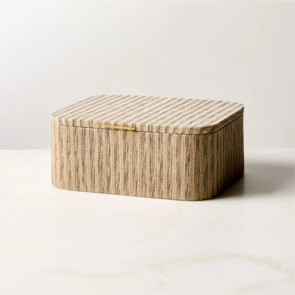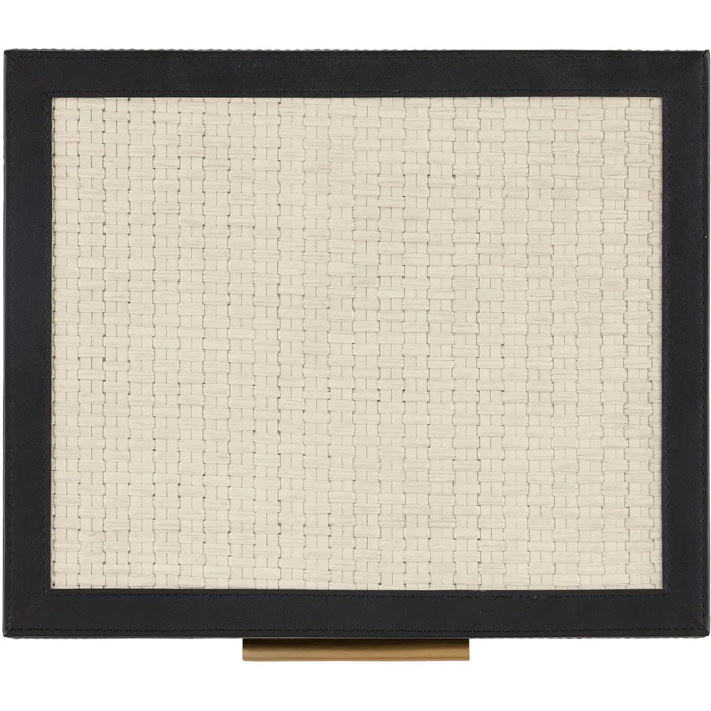 Made of intricately woven ivory raffia, the Deanna Box Set includes two sizes of decorative boxes with black leather tops, and light antique brass handles and hinges. The interiors of these black and ivory boxes are lined with beige micro suede for a luxurious feel. The uniformity of the weave on these boxes is created during a painstaking artisanal process.