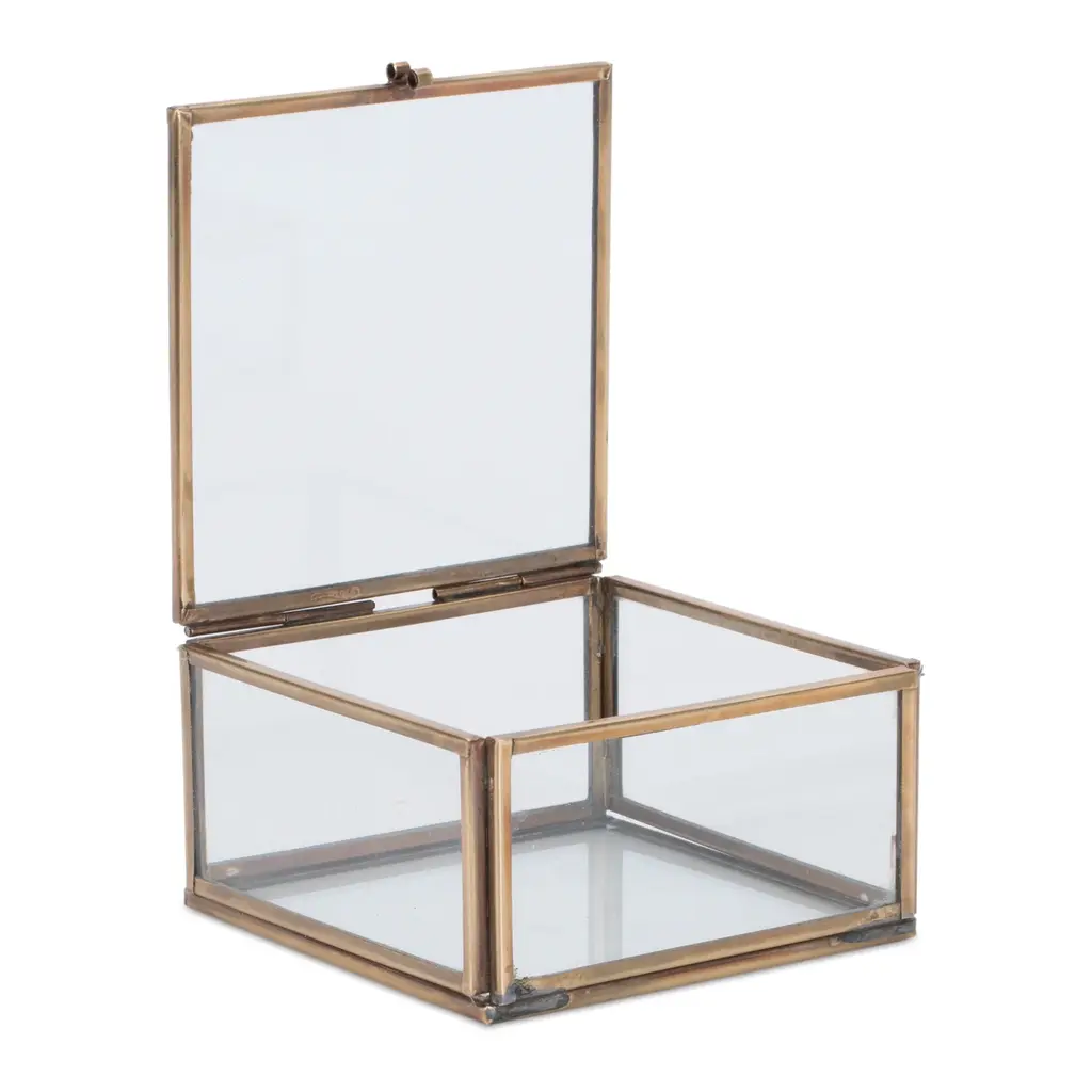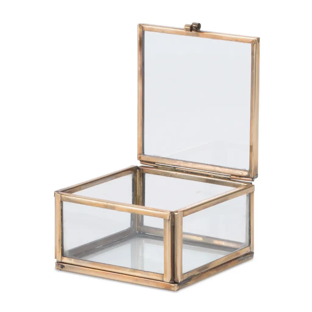 Elevate your storage and decor with the Decorative Glass Box set. Featuring chic gold and bronze tones with clear glass panes, these boxes offer a traditional square design with a functional latch accent. Sold in a set of two assorted sizes, these versatile boxes are perfect for storing decorative fillers like shells, pebbles, or dried florals. Use them on your bookshelf, tabletop, dresser, or vanity to display your favorite jewelry, earrings, or small trinkets.