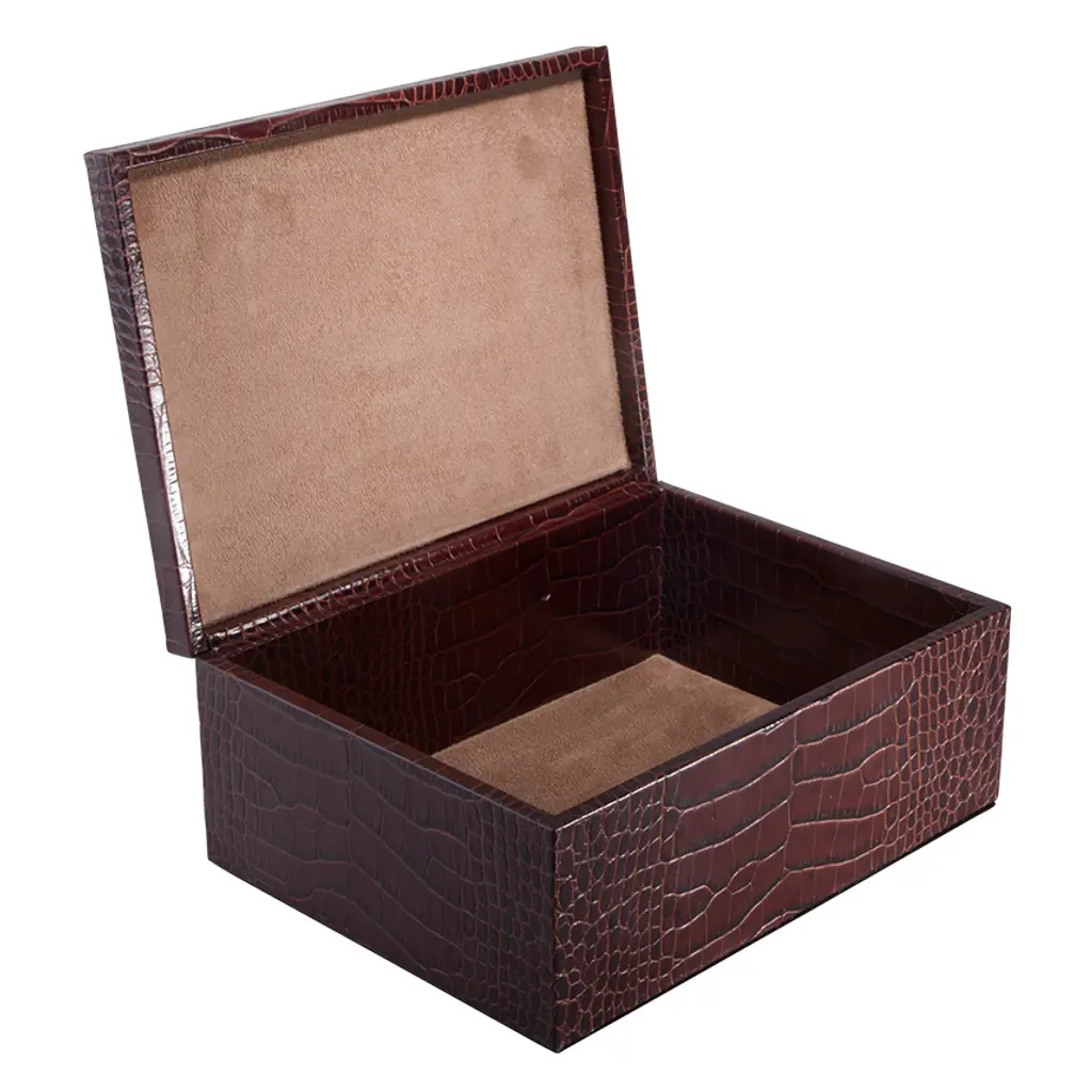 This handsome leather box makes a statement in any setting. An all leather box for your desk or dresser, ideal for holding stationery, watches, gadgets and more. Features a suede inside top and bottom with leather sides, and a slightly padded lid. Interior: 9" x 6-5/8" x 3-3/8" Embossed Croc Leather