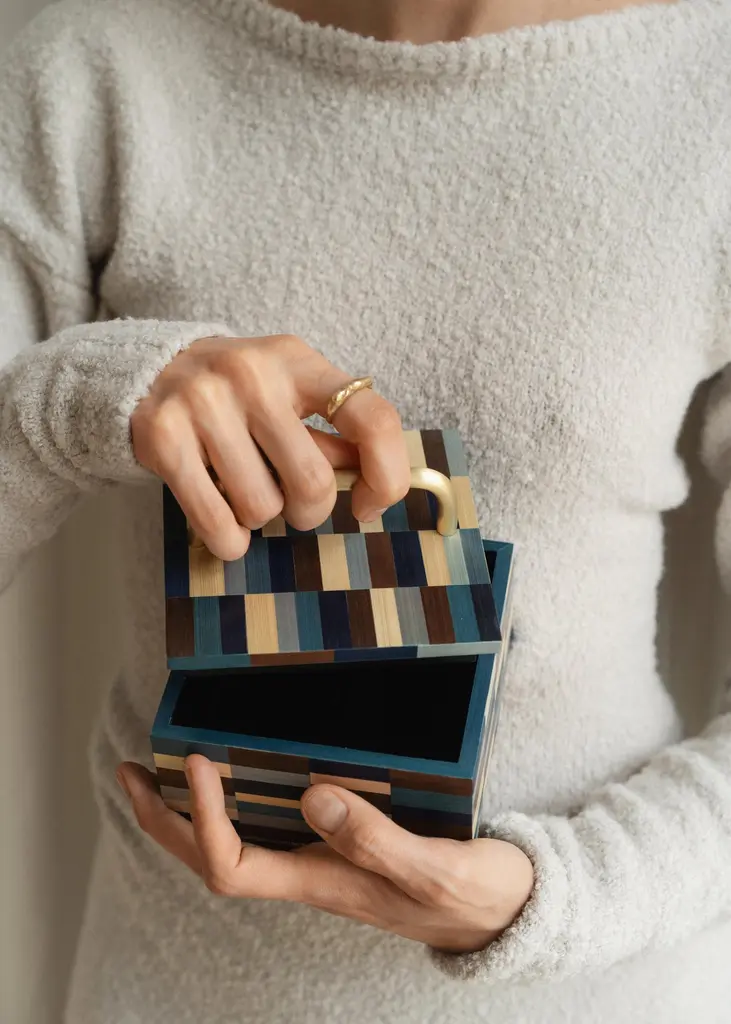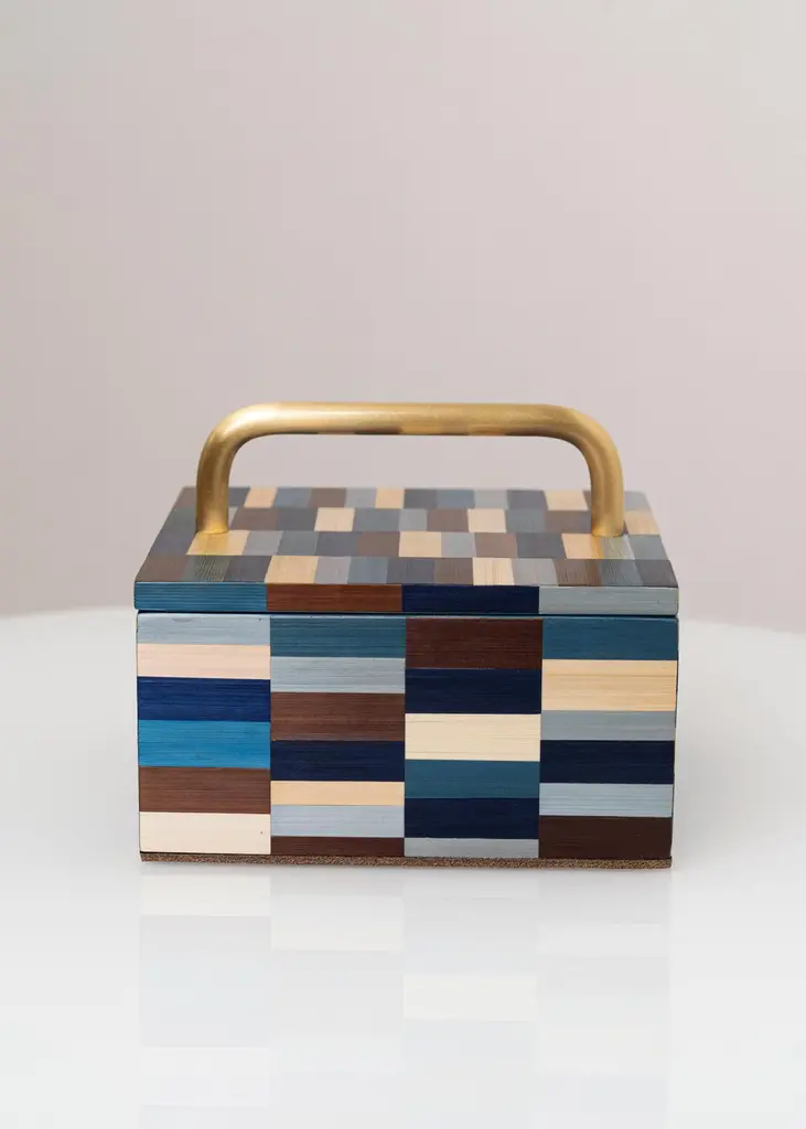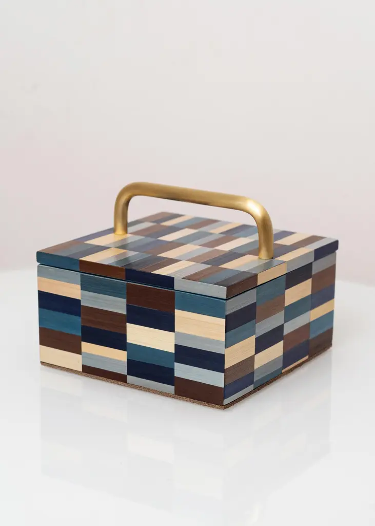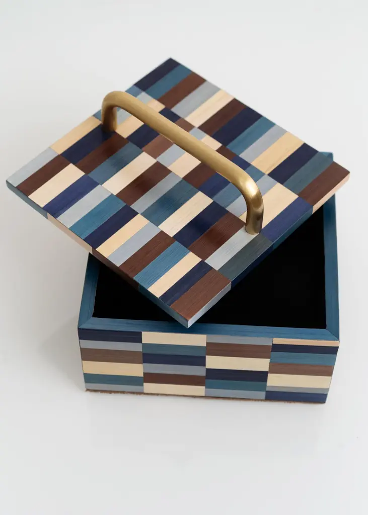 DECORATIVE BOX 03Inlay scheme: Subway Colour scheme: ColdAvailable in individuals colorsMATERIALS: MDF, painted rye straw, brass.DIMENSIONS (cm): 12x12x6,5.Packaging dimensions (cm): 14 x 14 x 12.Weight: 2 kgLead time: 2 weeks.