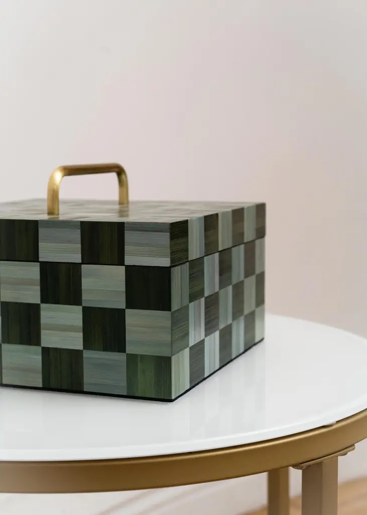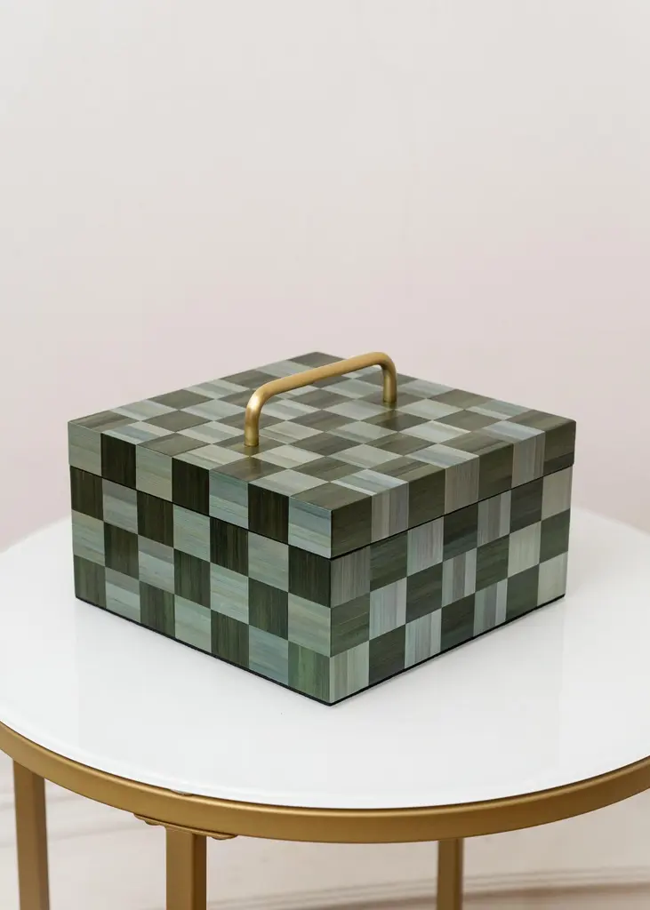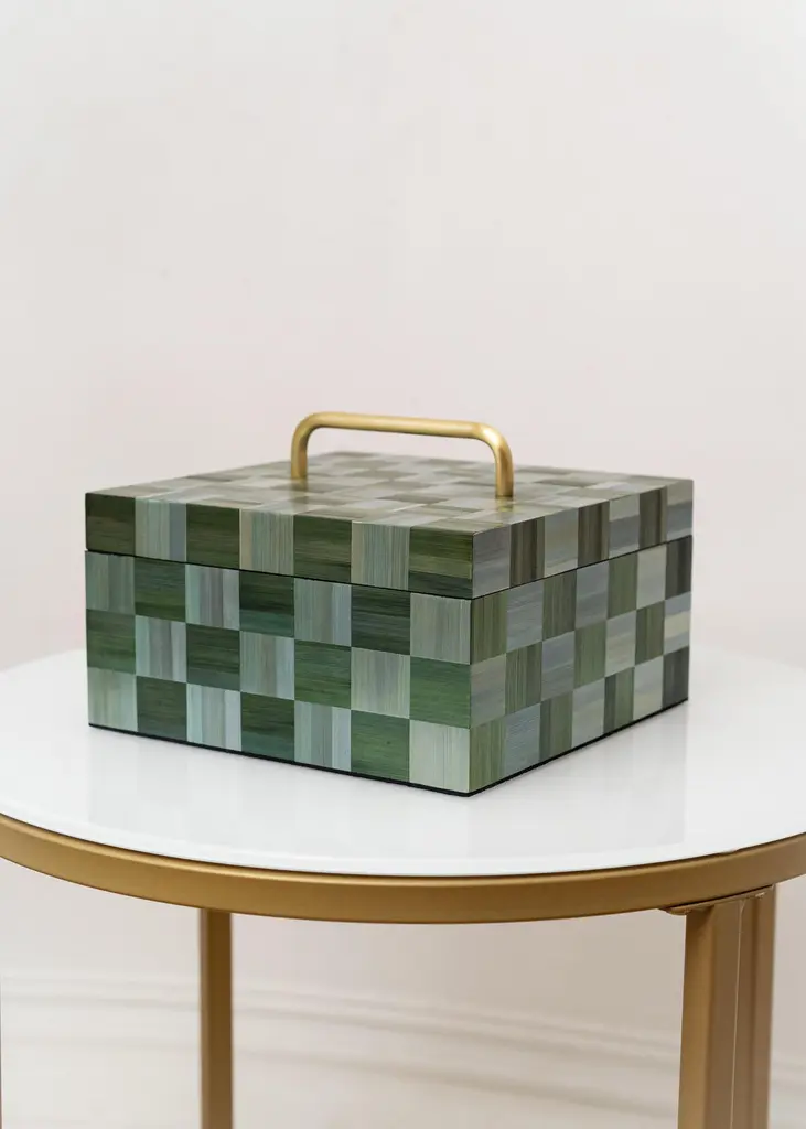 Decorative Treasure Box With Green Teal Checkerboard Straw Marquetry Artisanal