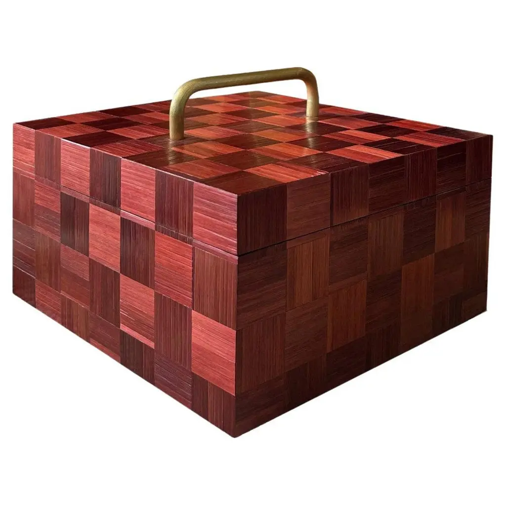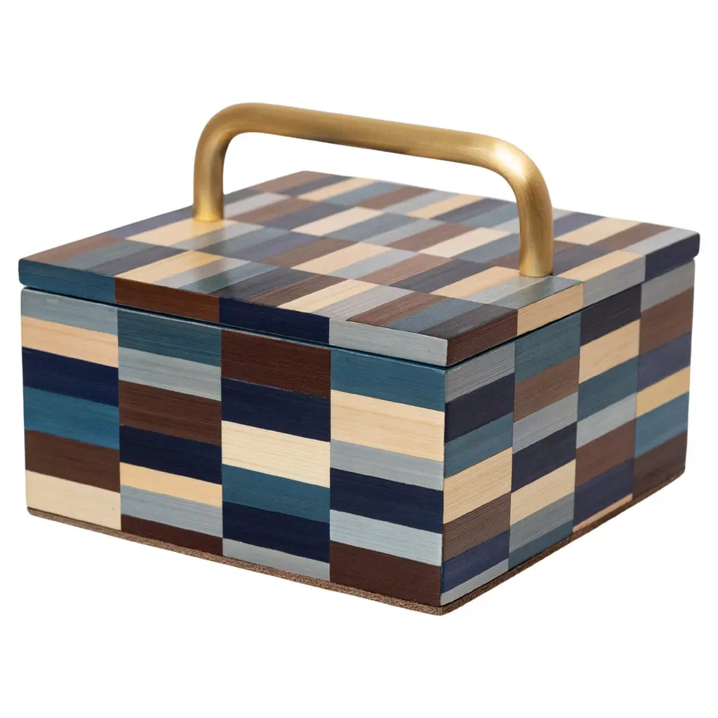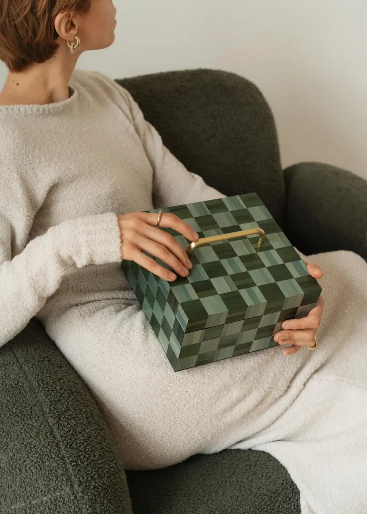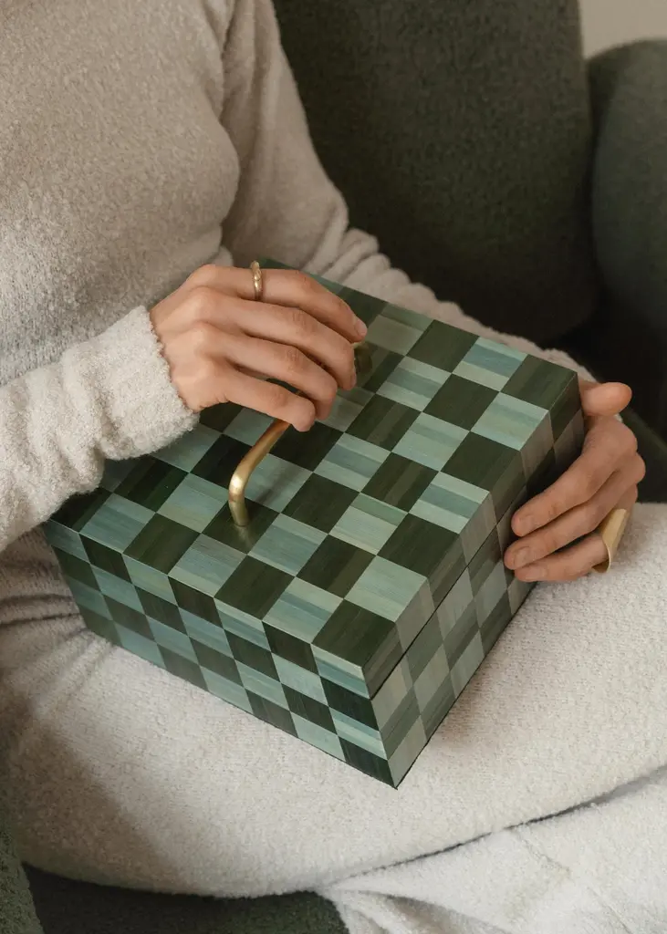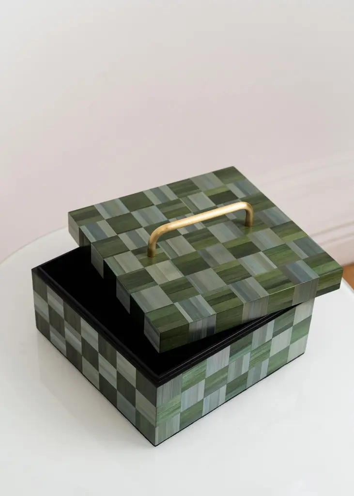 Straw Marquetry Decorative Box with Brass Handles Green Teal Inlay Checkerboard PatternDecorative Box 01 is a handcrafted square box created using the straw marquetry technique. Its surface features a checkerboard pattern composed of hand-dyed and flattened rye straw in deep teal and green tones, arranged with precise geometric alignment. The natural sheen of the straw gives the piece a soft, iridescent quality that changes with the light. The box is fitted with solid brass handle, adding both functional and visual contrast through warm metallic detail. Entirely handmade by Ruda Studio in Ukraine, this piece demonstrates a modern interpretation of traditional marquetry. Treasure Box 01 is ideal for storing small items or serving as a striking accent on a shelf or tabletop. Custom sizes and color palettes are available upon request.Inlay scheme: WeaveColour scheme: Green TealAvailable in individuals colorsMaterials: MDF, painted rye straw, brass.Dimensions (cm):20x20x10,5.Packaging dimensions (cm): 22 x 22 x 12.Weight: 3 kgLead time: 4 weeks.