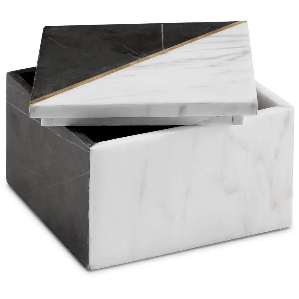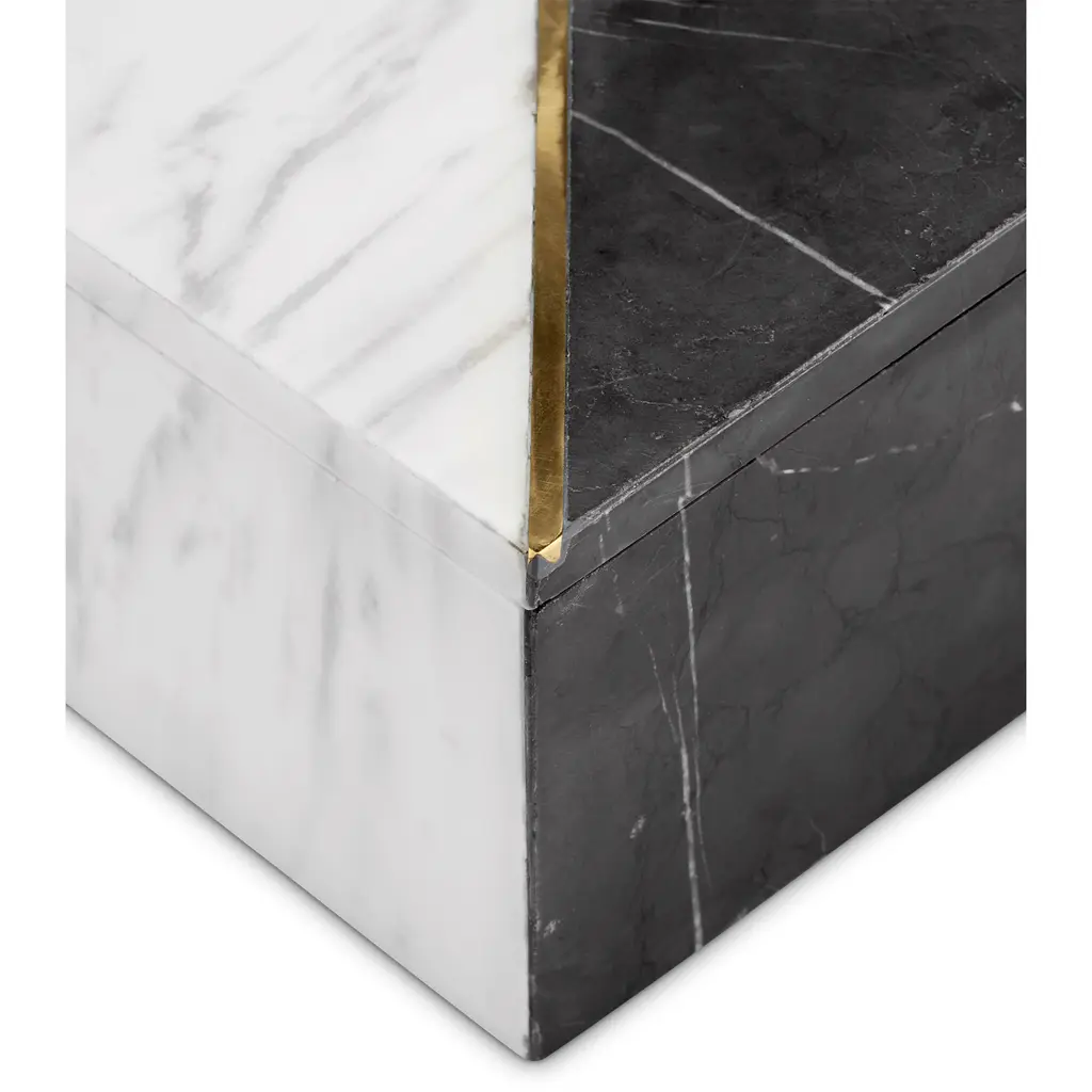 The Deena Marble Box is geometrically sophisticated. The white and pietra gray marble are juxtaposed against each other in a dynamic way: the two dark sides are topped with a triangle in the same color, and it is the same with the white. Slicing through the middle of the top to separate the two is a brass inlay on slant. The solid marble black and white decorative box has mitered joints and a composite coating on the bottom to keep it from scratching surfaces.