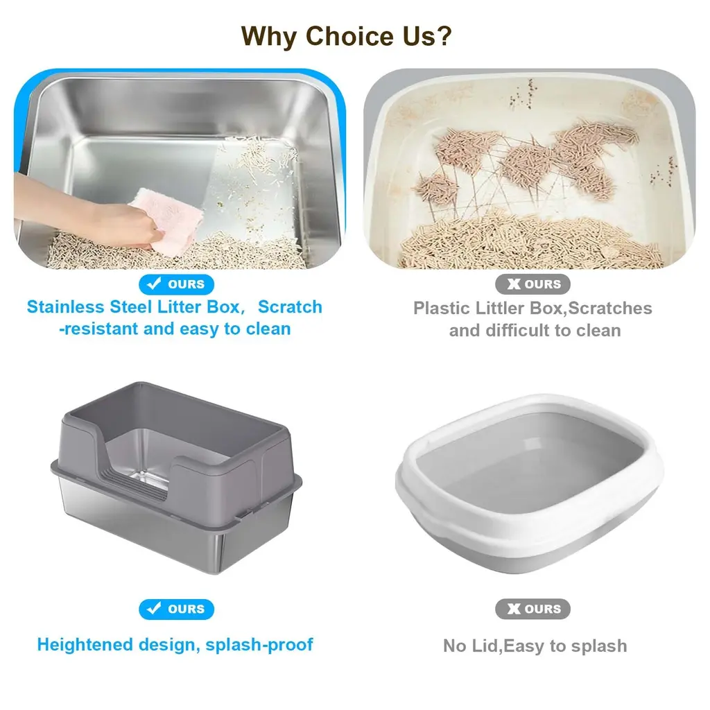1. Effective Splash Prevention and Odor Control The high fence cat litter box is designed to prevent cat litter from splashing, reduce odor spread, and keep your home's air fresh and surroundings clean. It’s an ideal solution for maintaining a hygienic and odor-free environment.2. Spacious and Secure Design Equipped with seamless high side fences, this litter box doubles the usable area, eliminating the hassle of litter spreading on the floor. Its tall sides ensure your cat stays contained while using the box, giving you peace of mind.3. Durable and Easy-Clean Stainless Steel Construction Made from high-quality stainless steel, this litter box features a non-stick surface that simplifies cleaning with just a quick rinse. Its non-porous design also prevents odors from lingering, ensuring it stays fresh and clean for longer.4. Practical Cat Litter Scoop Included Each litter box comes with a practical cat litter scoop, making it easy to clean up and maintain. The included accessory adds convenience and helps keep your cat's litter box tidy and fresh.5. Silent and Stable Placement With 4 silent anti-skid pads, this cat litter box stays securely in place, preventing noise and movement during use. It’s durable, resistant to rust and scratches, and accommodates small to medium-sized cats comfortably.