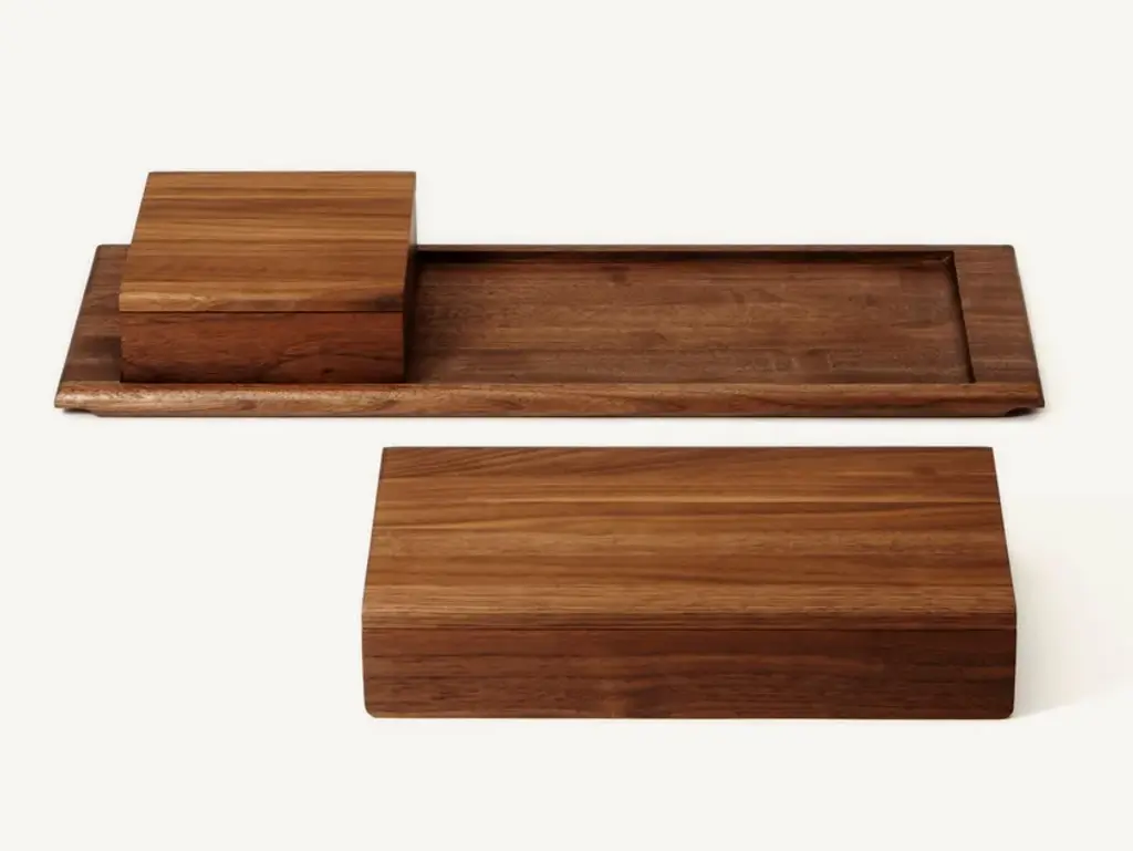 The Desk Accessories are a series of carved, solid wood storage containers. Materials: Solid Walnut. BassamFellows believes that every component of contemporary living should be beautiful, even the items some may consider quotidian. This notion - elevating an everyday storage receptacle into a piece of functional art - inspired the BassamFellows accessories collection. The Soft Series features gently turned edges, celebrating the tactile and warm nature of each piece, which is carved from a solid wood block. Items of sculpture in their own right, the series can be used individually or as part of the modular system. Consisting of a long box (CB-104), a short box (CB-105), each with lids, and an organizing tray (CB-106) these elemental, strikingly simple storage containers add an accent of luxury to any interior.