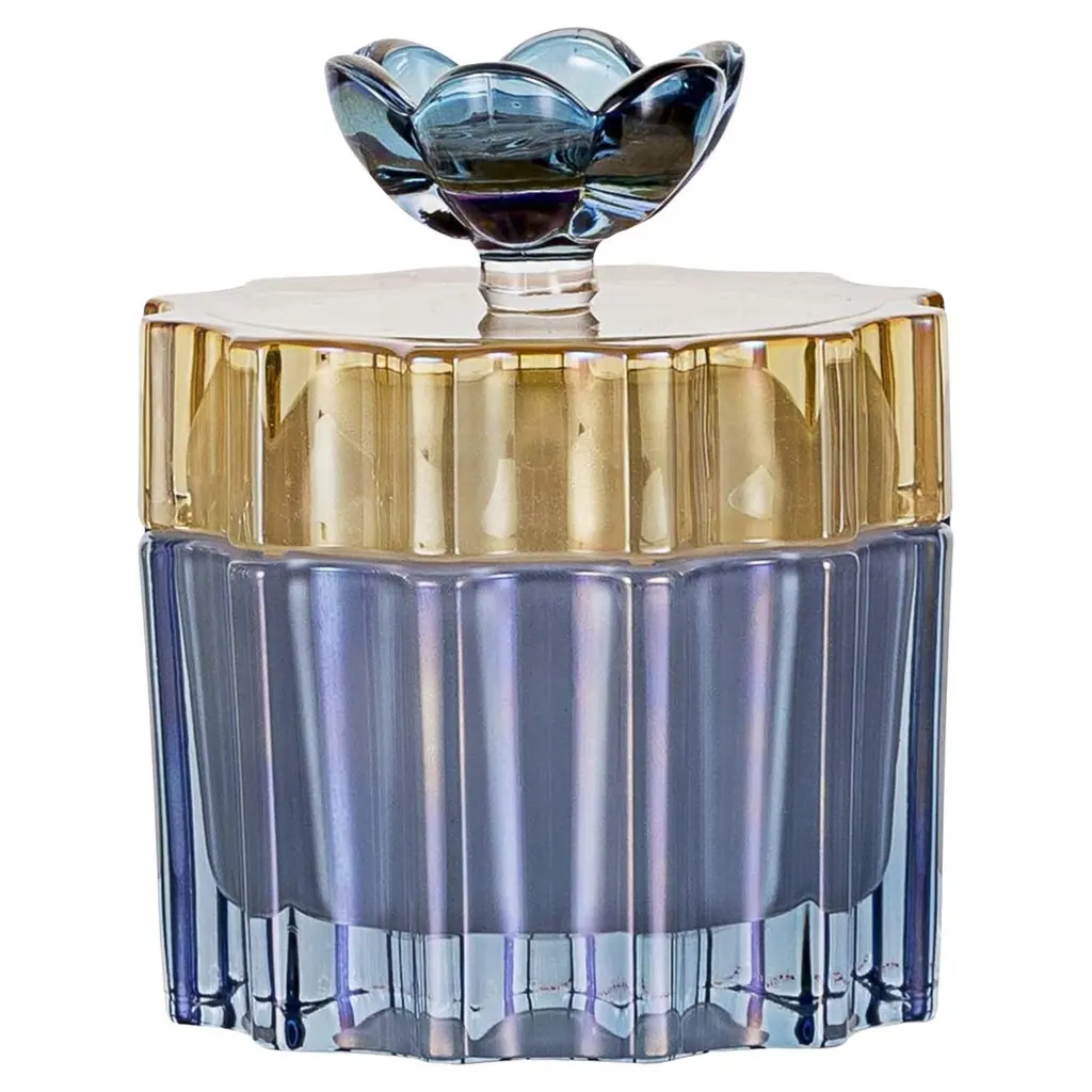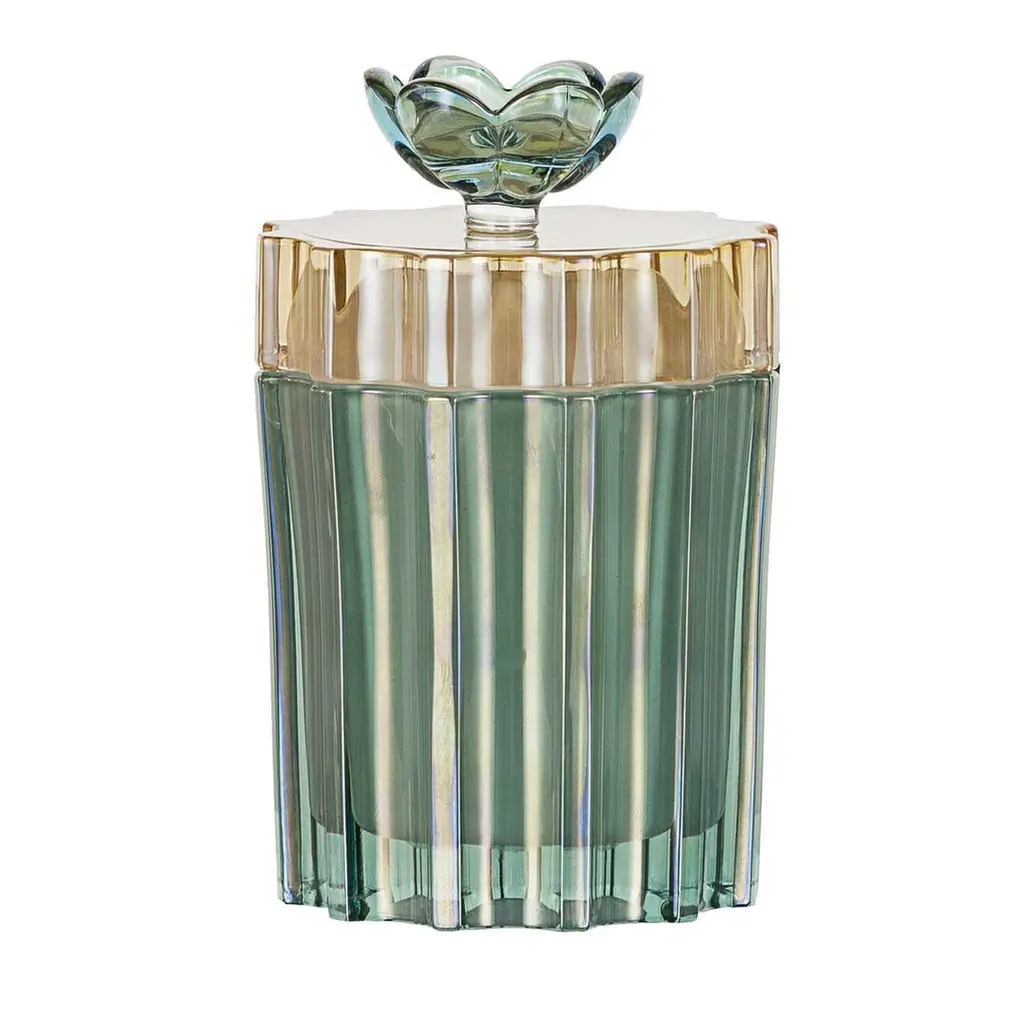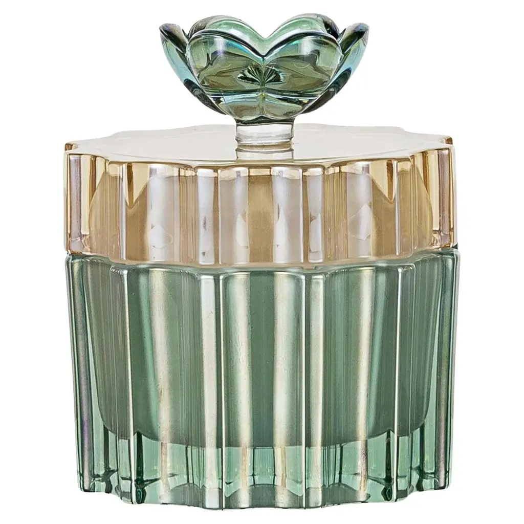 This glass box will add a colorful accent to any vanity table in a bedroom or powder room. Exquisitely decorated by hand, it is distinguished by a vertically etched pattern that creates a mesmerizing interplay of reflections on the green glass surface. Adorned with golden-colored details, this exquisite piece features a flower-shaped finial.