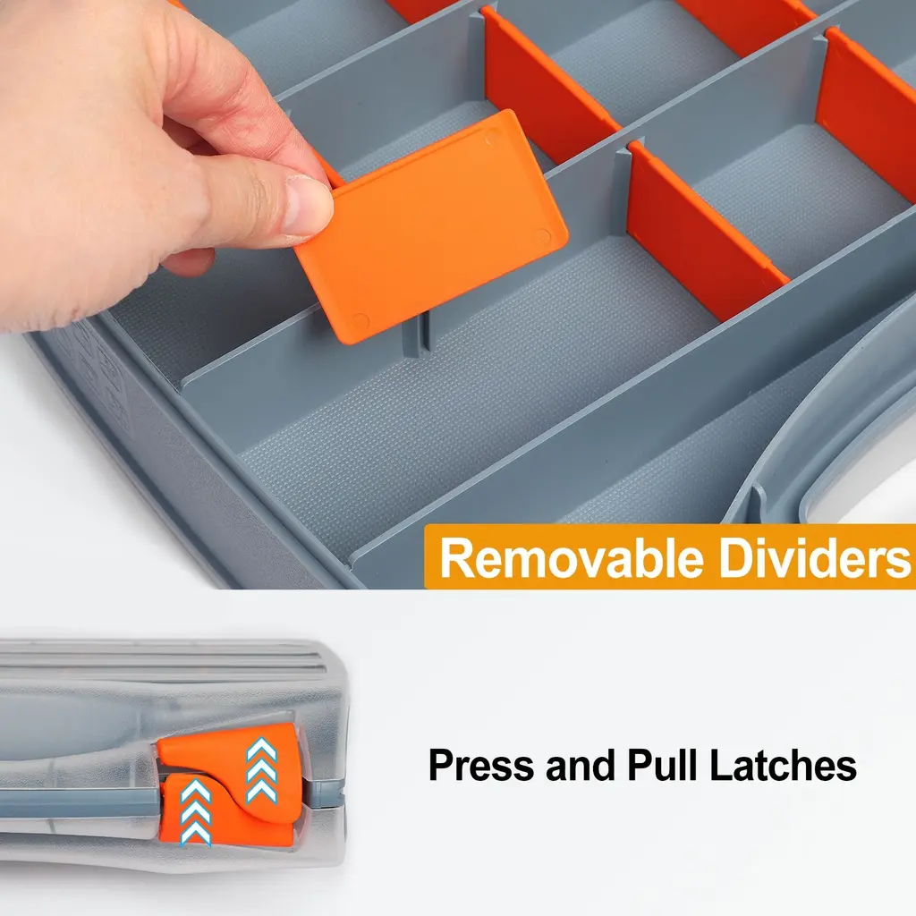 The tool box organizers are made of durable plastic material, which is reinforced and thickened, soft and not easy to break, and has good load-bearing capacity.The plastic storage box is equipped with a transparent cover, so you can quickly find the parts or hardware you need, and the internal compartments are removable and the position of the compartments can be adjusted according to the size of the items, suitable for personal or professional use.Two safety buckles are designed on the outside of the hardware toolbox, which can be easily opened or closed to prevent items from falling or being lost. The top carry handle makes it easy to carry and store in your garage, closet, shed, or vehicle.The hardware tool box can be used to store various small objects, fasteners, nuts, bolts, screws, handicrafts, small mechanical parts, DIY hobby items, etc. It can be used as a repair tool box, welding repair box, water pipe maintenance box, woodworking storage box, paint storage box, home appliance repair box, etc.