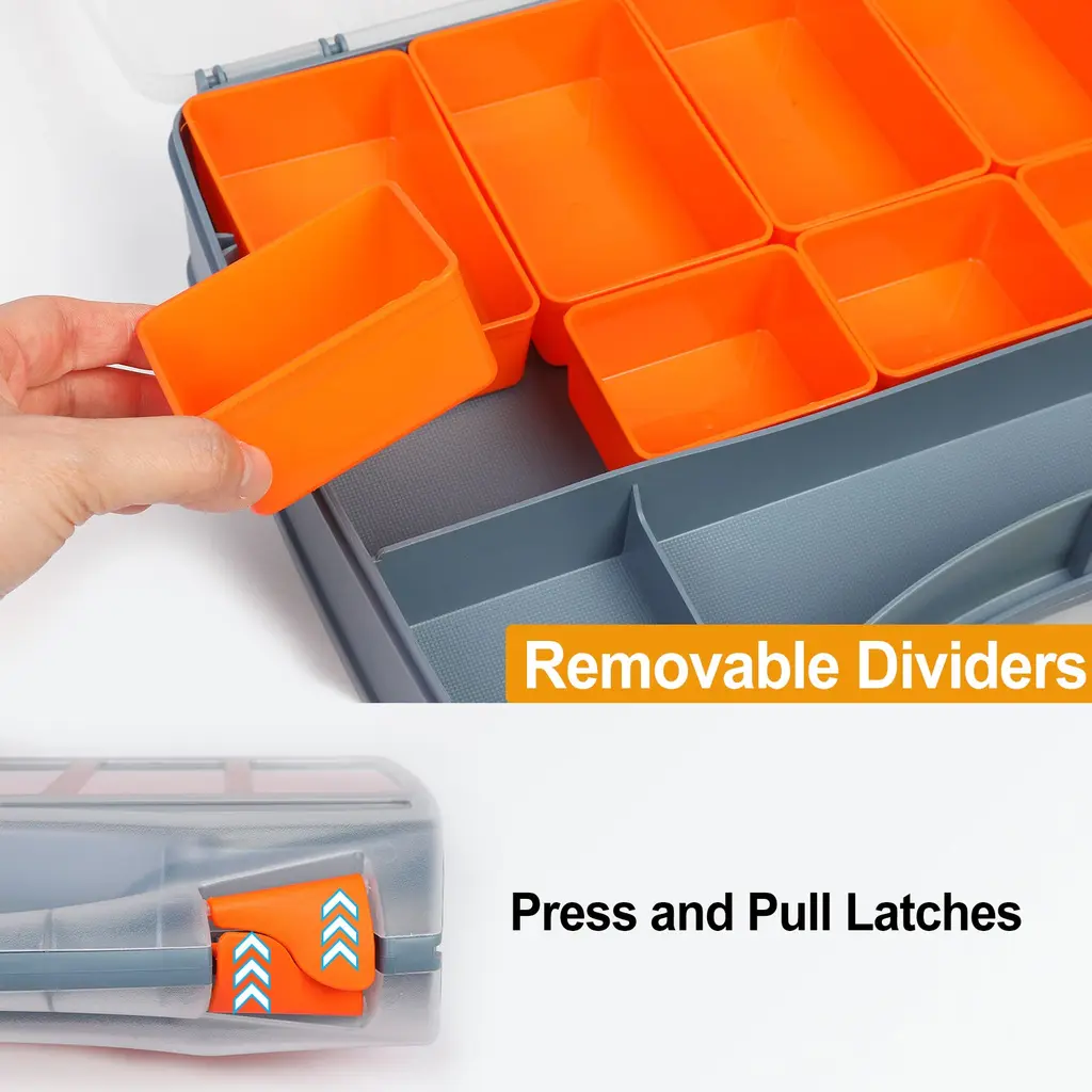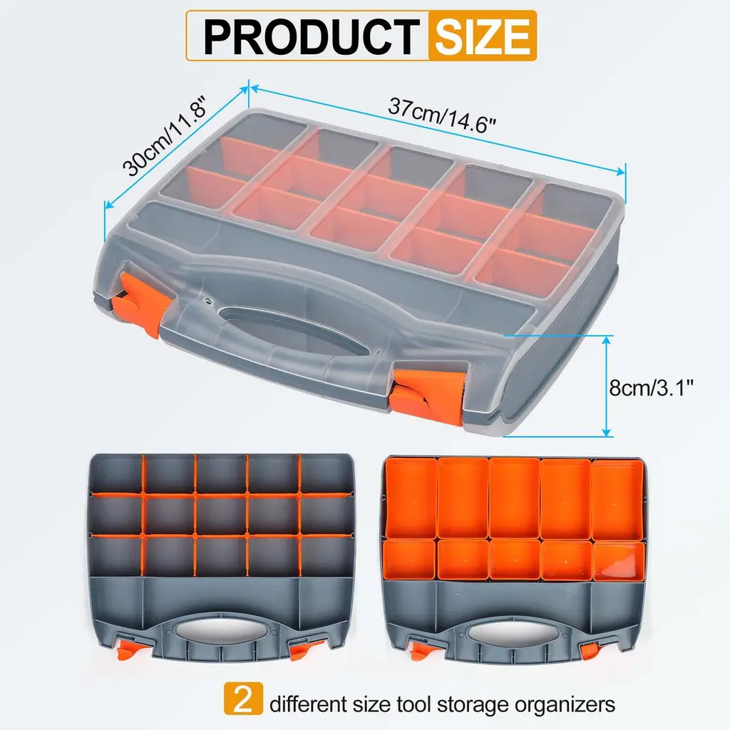 The tool box organizers are made of durable plastic material, which is reinforced and thickened, soft and not easy to break, and has good load-bearing capacity.The plastic storage box is equipped with a transparent cover, so you can quickly find the parts or hardware you need, and 2 different size tool storage organizers suit various demands for different-sized items, suitable for personal or professional use.Two safety buckles are designed on the outside of the hardware toolbox, which can be easily opened or closed to prevent items from falling or being lost. The top carry handle makes it easy to carry and store in your garage, closet, shed, or vehicle.The hardware tool box can be used to store various small objects, fasteners, nuts, bolts, screws, handicrafts, small mechanical parts, DIY hobby items, etc. It can be used as a repair tool box, welding repair box, water pipe maintenance box, woodworking storage box, paint storage box, home appliance repair box, etc.