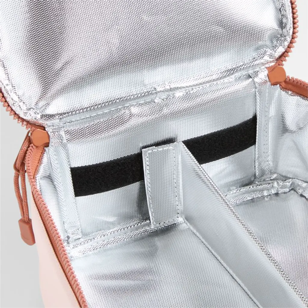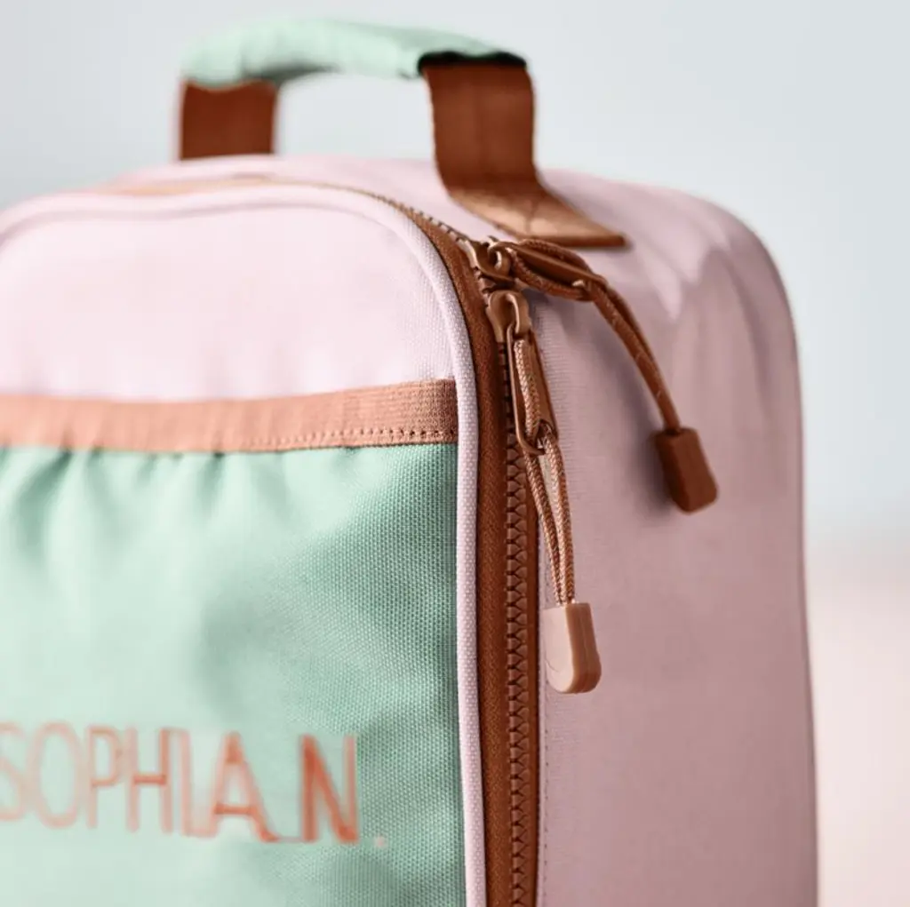 We spoke to hundreds of parents to get our lunch boxes just right. Our Dreamer Standard Soft Lunch Box is perfectly sized to fit multiple food containers, with an adjustable interior divider to keep everything in place and a roomy exterior pocket. In durable, insulated and easy-wipe polyester (that includes recycled plastic bottles), the colorblock print has a stylish yet playful quality that kids will love. For extra personality, have it monogrammed with a child's name or initials.