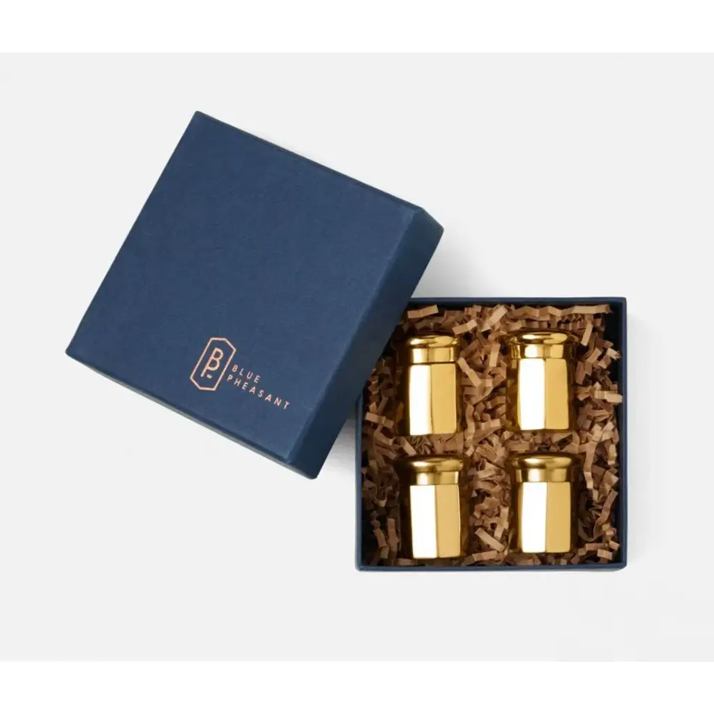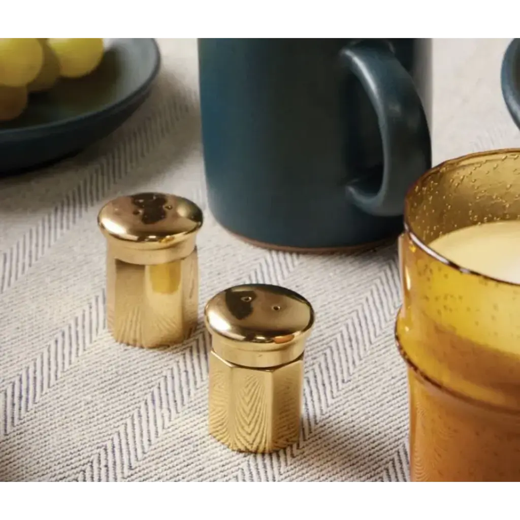 Finish: Gold Material: Brass With round tops and faceted sides, this is the classic salt-and-pepper shaker set—but with a glamorous twist. Available in brass with a polished gold or pewter finish, in either standard or mini sizes. Blue Pheasant's products are handmade with care by artisans using natural materials. They are not mass produced, so variation between products should be expected, and this is why we love them! It is these irregularities that makes Blue Pheasant what it is—a special brand whose collections are distinctly handmade, full of charm and originality you’ll never find in machine-made products.