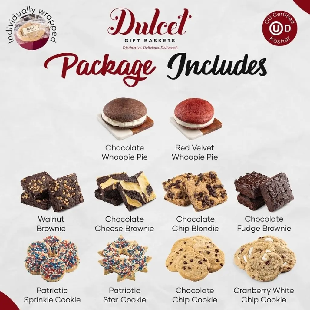 The Glitter and shine of Shooting stars and Fireworks is a reminder of July 4th. Dulcet has recreated this amazing day to new heights. This Gift Basket is Patriotic and American and tells of Freedom & Celebration. 6 Vanilla Cookies drizzled with red, blue, and white icing, 2 Red Velvet Whoopie Pies, Decadent, and Rich, and 4 bittersweet ganache Chocolate Brownies topped with walnuts, all individually wrapped. Arrives on Our Signature Box wrapped with care. Let us all Celebrate our Beautiful country with pride for all its glory! Dulcet Gift Baskets 24 Pcs Classic Patriotic Gift Box - Gourmet Treats for Every Occasion Multipack Quantity 1