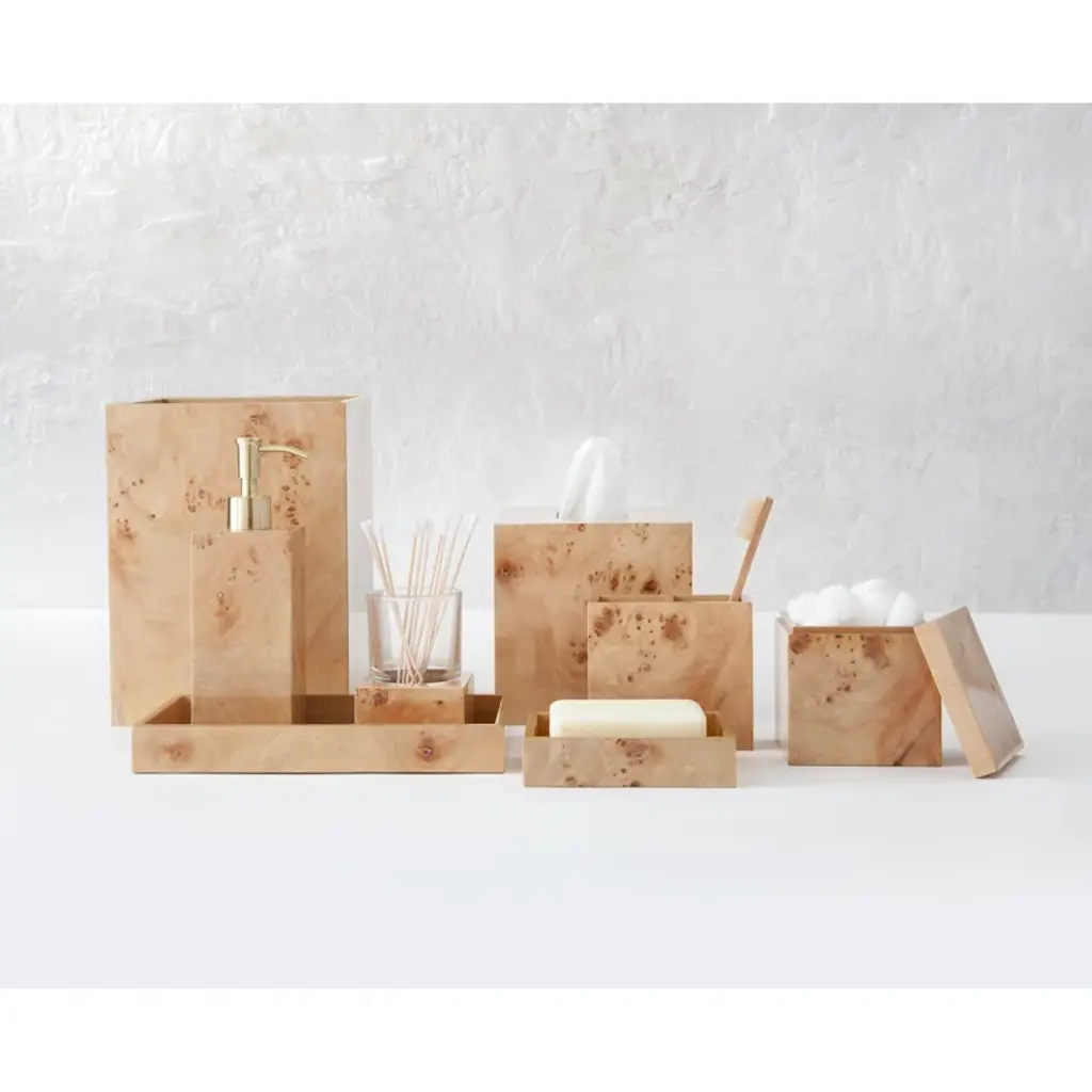 Give your bathroom a nature-refined touch with these honey-colored bath accessories crafted from burl wood. Due to the nature of this material, each piece is slightly unique. The digital images we display have the most accurate color possible. However, due to differences in computer monitors, we cannot be responsible for variations in color between the actual product and your screen.