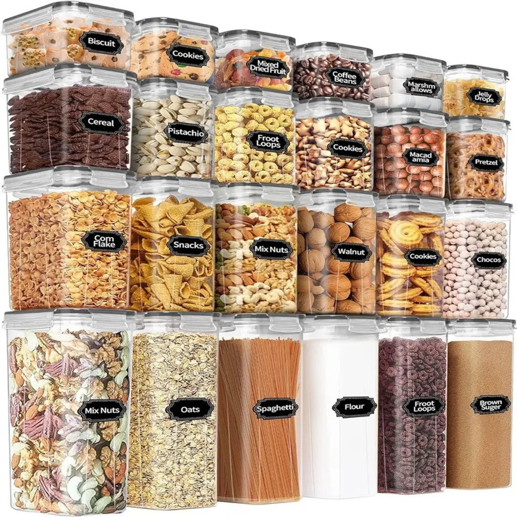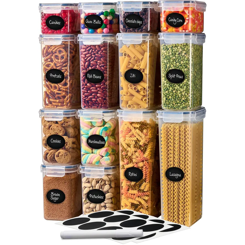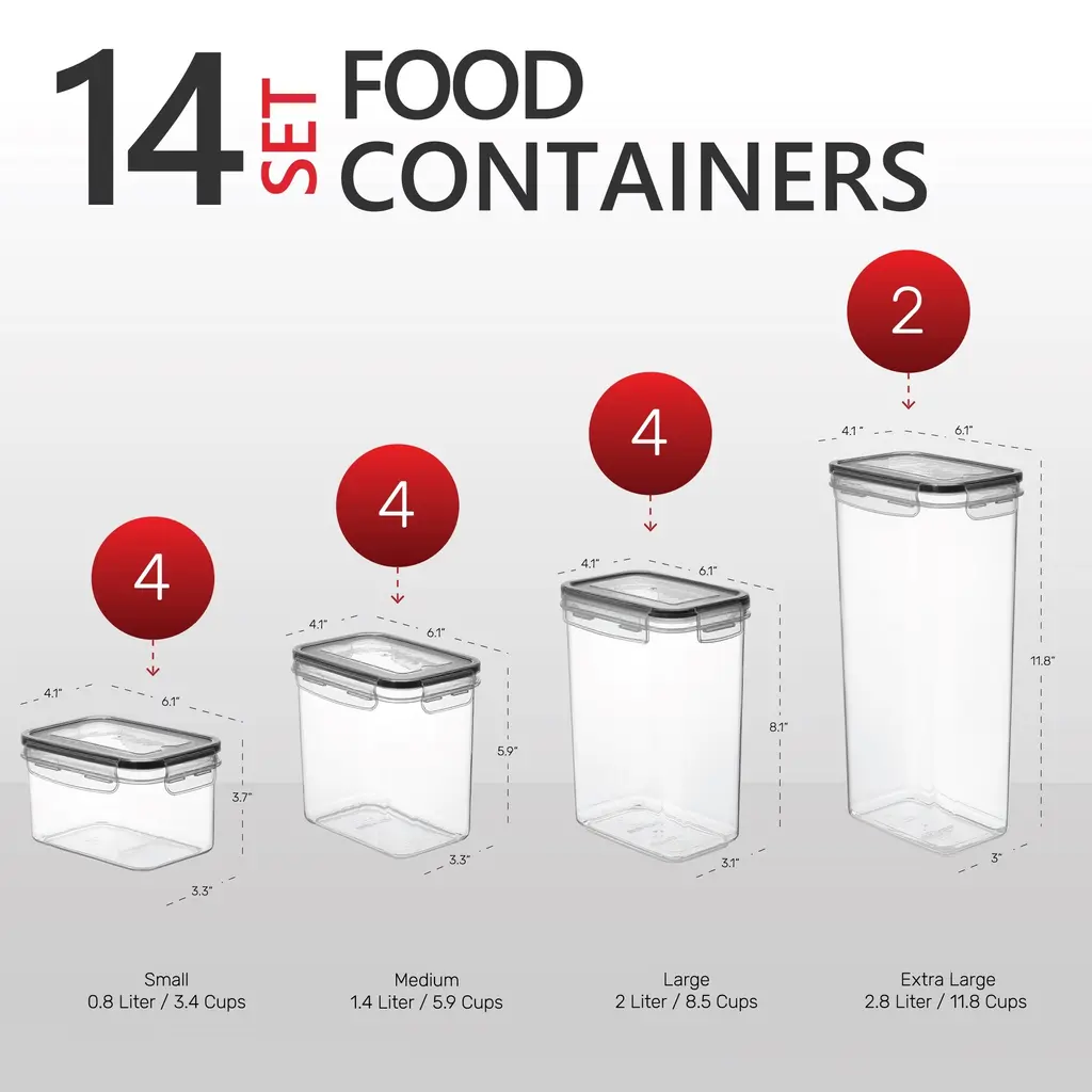 Set of 14 - This Kitchen Storage Containers Set includes: 2 Tall Spaghetti Container Storage (2.8 L /11.8 Cups), 4 Large Food Storage Containers with Lids (2 L/8.5 Cups), 4 Medium Kitchen Canisters (1.4 L/5.9 Cups), 4 Small Air Tight Pantry Storage Containers (0.8 L /3.4 Cups).Stackable & Space Saving Design: These Durable Pantry Storage Containers Are Designed To Be Stackable, Helps You Make Efficient Use of Every Inch of Your Kitchen Freezer Or Cupboard. The Canisters Sets for the Kitchen enable you to organize your Home and Free up Space In The Pantry.Airtight Seal to Keep Food Fresh: The Side-Locking Lids Ensure That No Air or Water Goes Into Your Favorite Snacks And That They Should Stay Super Fresh And Dry. These Plastic Food Storage Containers With Lids Are Very User Friendly, Easy to Clean, and Dishwasher Safe.16 Reusable Labels & Marker: The Bakers Storage Container Set has 2 Sheets of 8 Black Reusable and Rewritable Labels That Will Help You Identify Your Food Easily.High Quality: The Kitchen Containers Storage Set Is Made of High-quality Bpa Free Food Grade Plastic, It's Long-lasting Use, and Compact to Storage, Even When It's Not in Use by Placing Them into Each Other, Thanks to Its Stackable Design.
