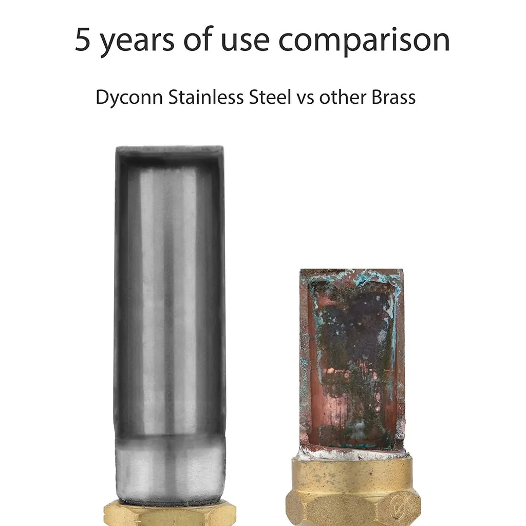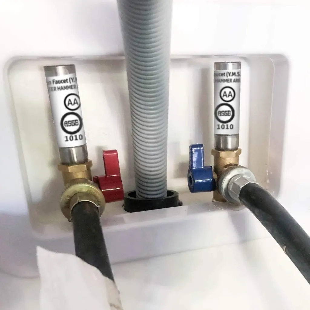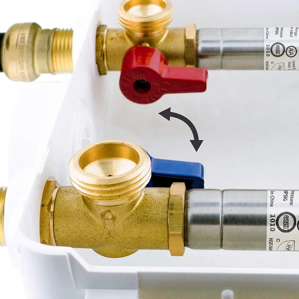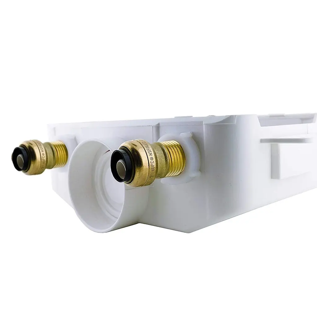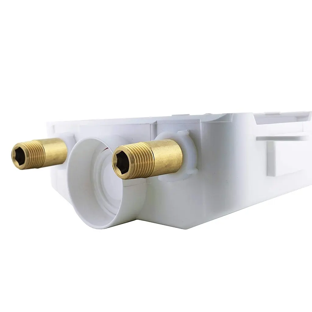 Dyconn Faucet MH Series Washing Machine Outlet Box with stainless steel hammer arrest is designed to prevent water shockwaves caused by the washing machine's shut-off valve. The MH Series is constructed with lead-free for the valve body & 304 stainless steel for the hammer arrestor's tube. By using 304 stainless steel for the hammer arrestor's tube, it ensures the inner wall of the tube will never rust or corrode like copper tubes. This reduces the possibility of adding unwanted friction to the arrestor ball inside the tube. All MH boxes comes with an adjustable mounting bracket & a snap-on faceplate to accommodate up to 3/4" of thick drywall. Two knock-out drain holes are designed in the center of the box (top and bottom). 2 Pieces Washing Stop Valve With Stainless Steel Water Hammer Arrestor Stainless Steel Tubes Will Never Rust or Corrode Like Copper Tubes F1807 (1/2" Crimp PEX) Inlet to 3/4" MNH Outlet , CONNECTION: Center Drain Connection Snap On Faceplate To accommodates Up To 3/4" Thick Drywall Adjustable Mount Bracket Included With Recessed Installation