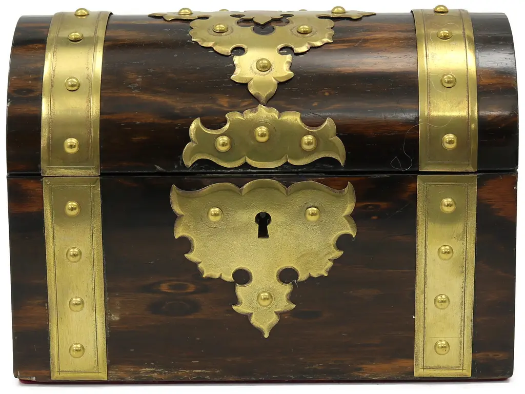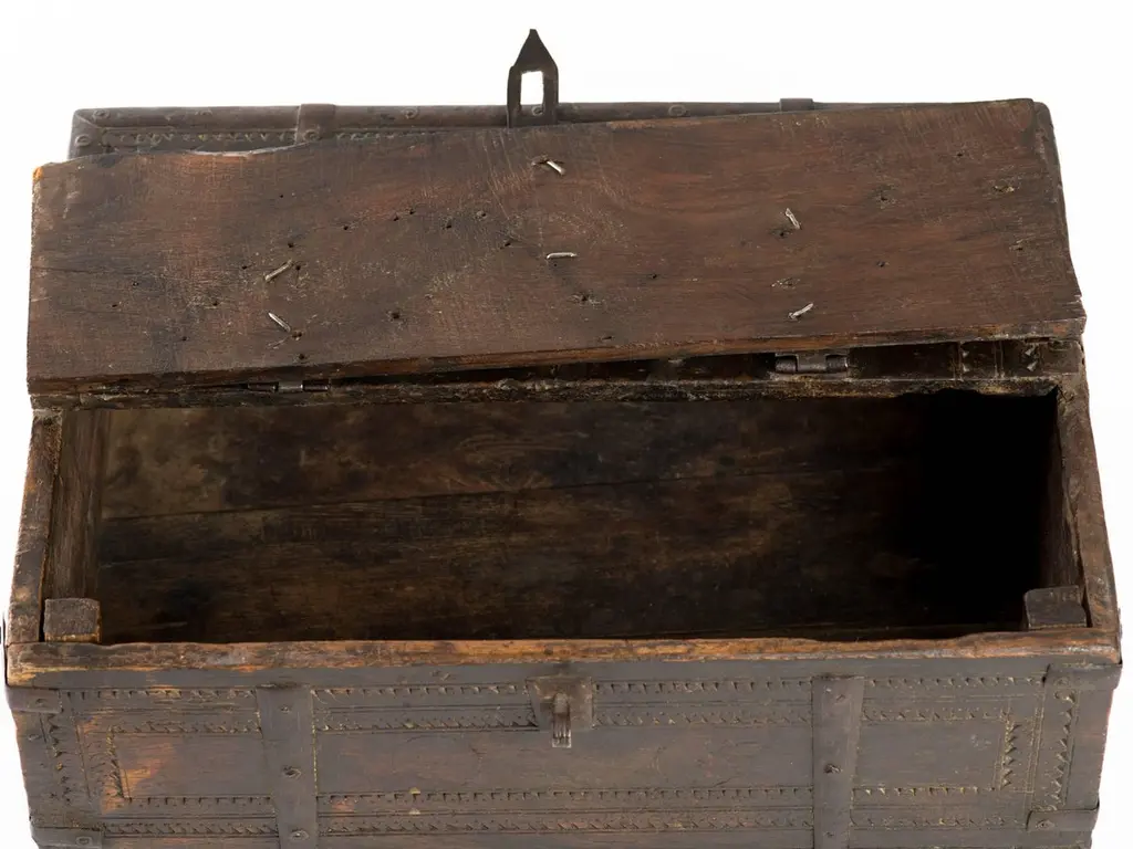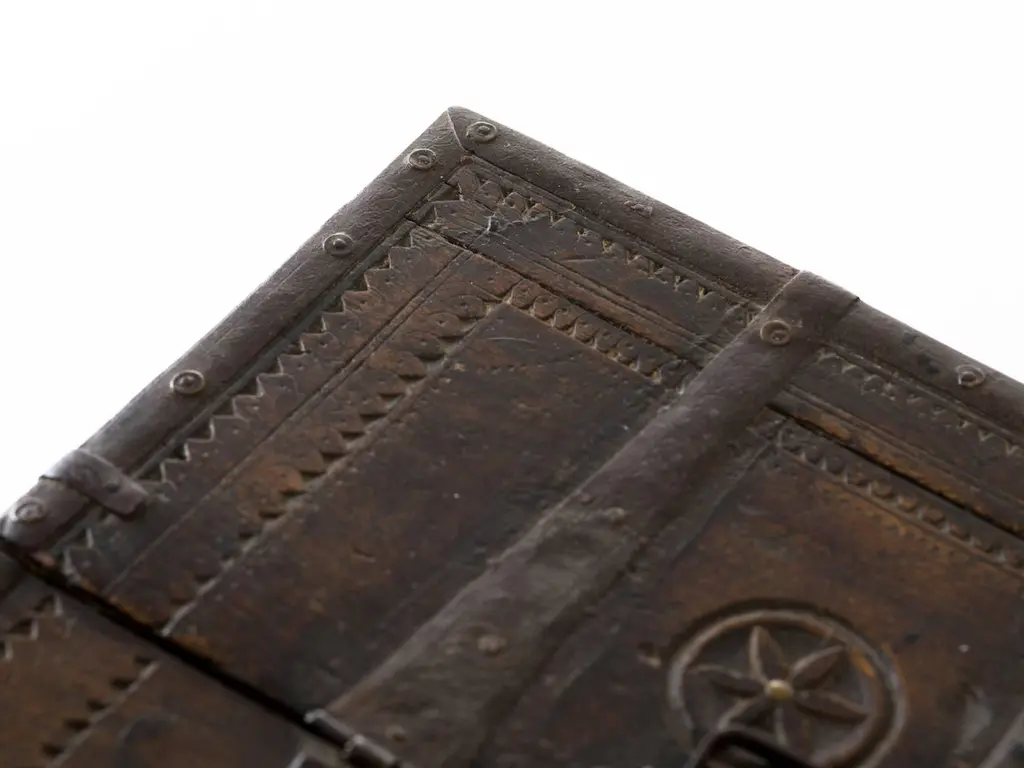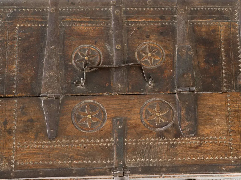 Hand-carved wooden Indian tribal storage chest box with hand-wrought iron hinges and straps, and handle. Early 20th century, Northern India.