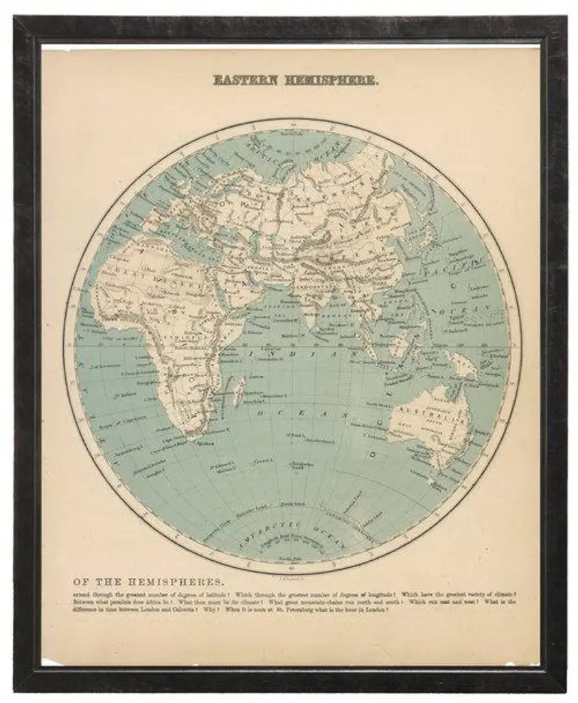 Presenting an Eastern hemisphere map framed in a pewter shadowbox