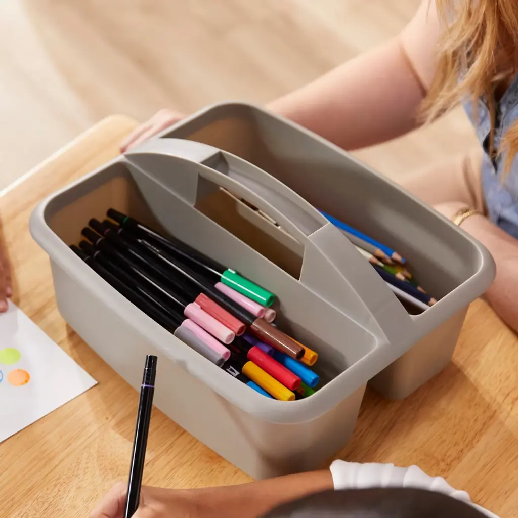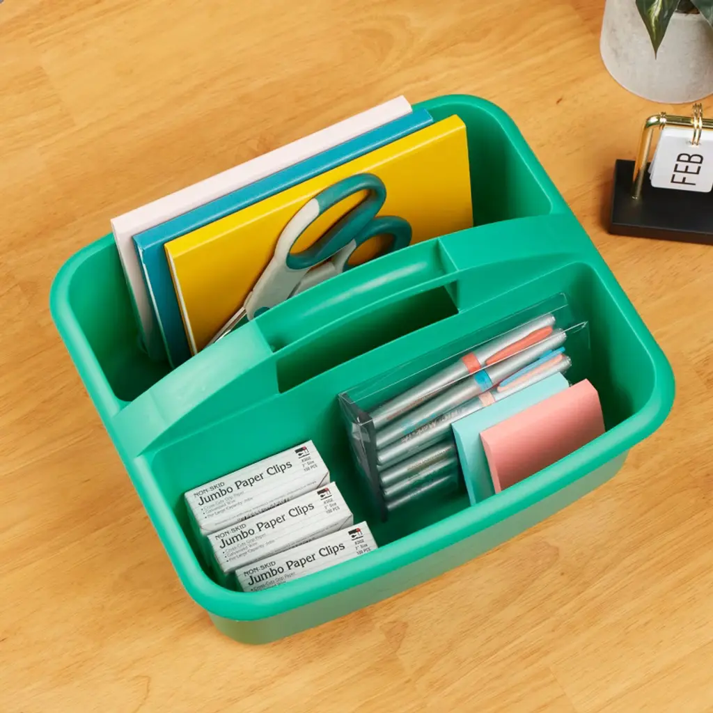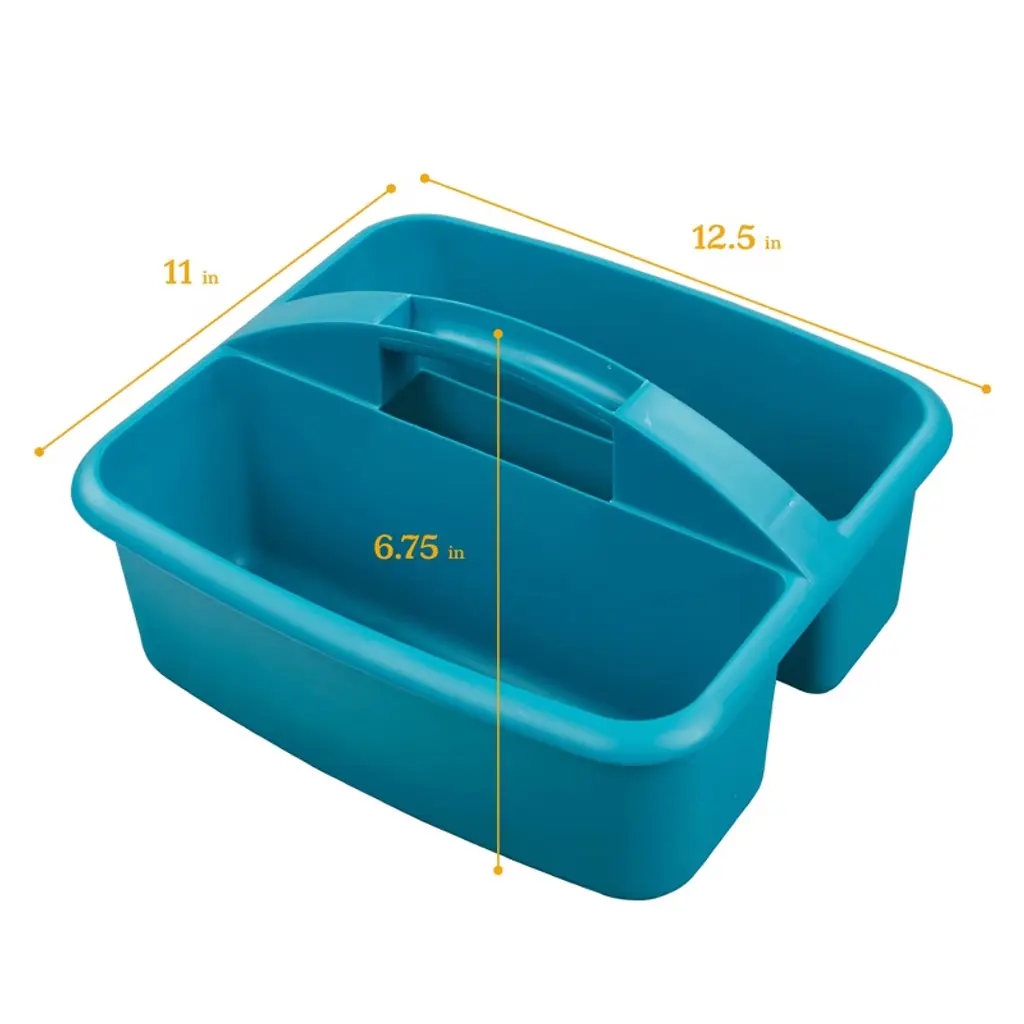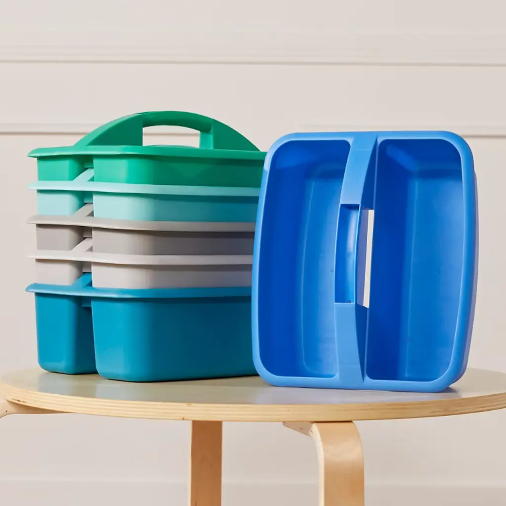 Cultivate a collaborative environment with ECR4Kids 2-Compartment Large Caddies. These sturdy supply organizers are perfect for teachers and educators to use in the classroom or library. Plastic bins provide a storage solution with endless possibilities for office supplies, writing utensils in a home, or toiletries in a college dorm. Each of the three compartments is designed to keep small items organized on and off the floor. In the classroom, caddies help while facilitating lessons and encourage team-oriented activities. The versatile storage containers are easily transported to workstations to conduct art lessons, science experiments, or STEAM activities. Use compartments to sort objects by color, size, shape, or any other characteristic. Create themed kits for subjects such as a weather kit with thermometers and charts. Store art supplies for paints, brushes, clay, and other materials. Little learners will learn the importance of organization by returning pens, scissors, glue, and crayons to the intended compartment during cleanup. Keep track of school supplies and personal belongings by having a specific place with structured compartments. Supply organizers feature rounded edges, an easy-to-grasp scoop center handle, and a curved interior to simply remove contents. Caddies conveniently nest to save valuable classroom space.