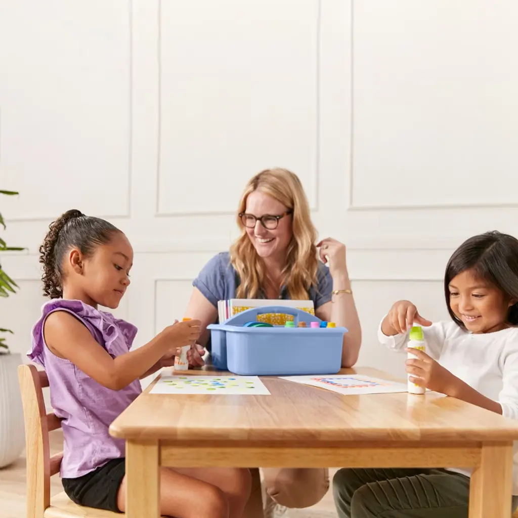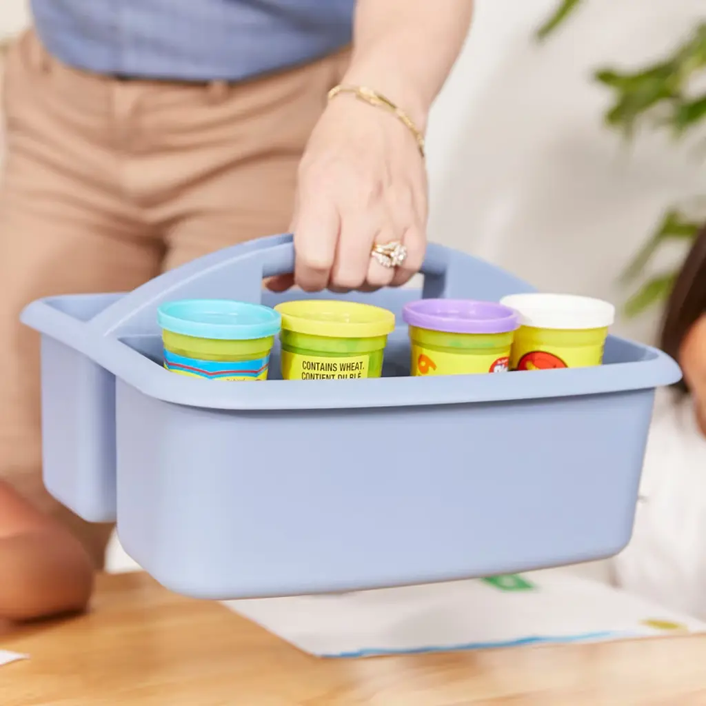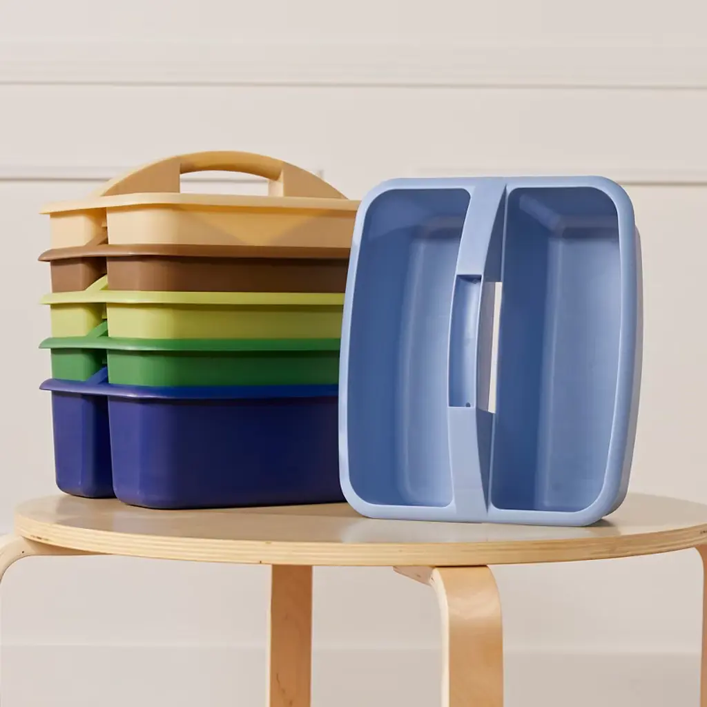 Cultivate a collaborative environment with ECR4Kids 2-Compartment Large Caddies. These sturdy supply organizers are perfect for teachers and educators to use in the classroom or library. Plastic bins provide a storage solution with endless possibilities for office supplies, writing utensils in a home, or toiletries in a college dorm. Each of the three compartments is designed to keep small items organized on and off the floor. In the classroom, caddies help while facilitating lessons and encourage team-oriented activities. The versatile storage containers are easily transported to workstations to conduct art lessons, science experiments, or STEAM activities. Use compartments to sort objects by color, size, shape, or any other characteristic. Create themed kits for subjects such as a weather kit with thermometers and charts. Store art supplies for paints, brushes, clay, and other materials. Little learners will learn the importance of organization by returning pens, scissors, glue, and crayons to the intended compartment during cleanup. Keep track of school supplies and personal belongings by having a specific place with structured compartments. Supply organizers feature rounded edges, an easy-to-grasp scoop center handle, and a curved interior to simply remove contents. Caddies conveniently nest to save valuable classroom space.