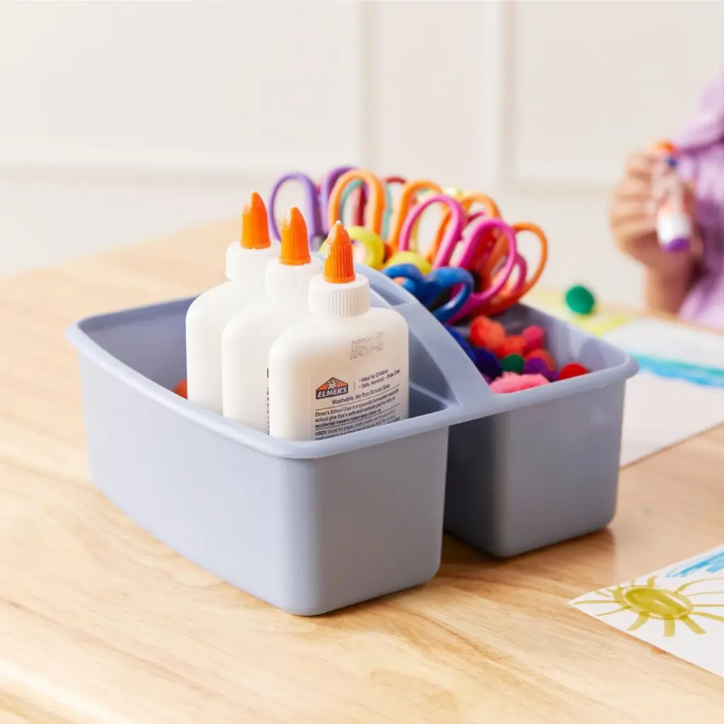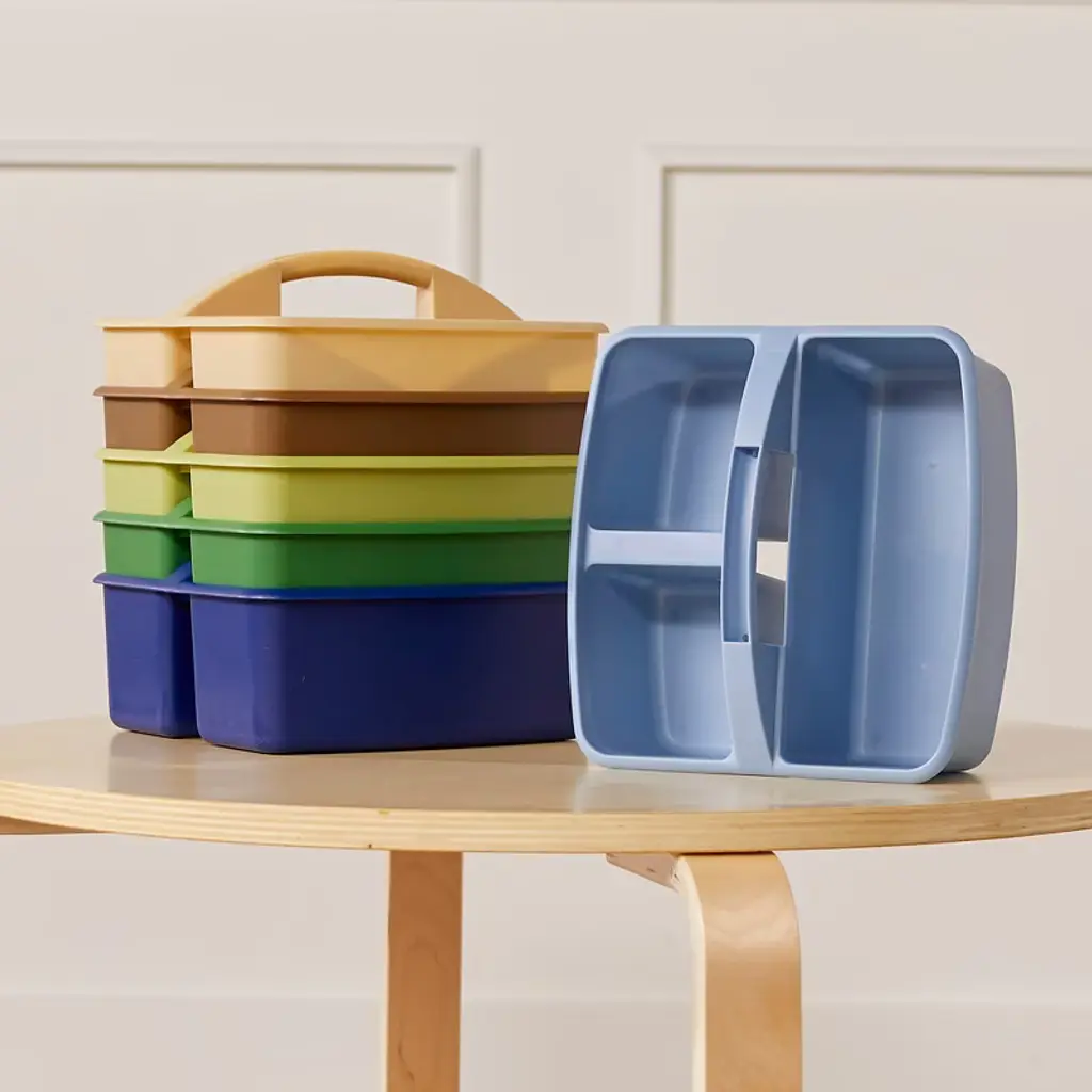 Cultivate a collaborative environment with ECR4Kids 3-Compartment Small Caddies. These sturdy supply organizers are perfect for teachers and educators to use in the classroom or library. Plastic bins provide a storage solution with endless possibilities for office supplies, writing utensils in a home, or toiletries in a college dorm. Each of the three compartments is designed to keep small items organized on and off the floor. In the classroom, caddies help while facilitating lessons and encourage team-oriented activities. The versatile storage containers are easily transported to workstations to conduct art lessons, science experiments, or STEAM activities. Use compartments to sort objects by color, size, shape, or any other characteristic. Create themed kits for subjects such as a weather kit with thermometers and charts. Store art supplies for paints, brushes, clay, and other materials. Little learners will learn the importance of organization by returning pens, scissors, glue, and crayons to the intended compartment during cleanup. Keep track of school supplies and personal belongings by having a specific place with structured compartments. Supply organizers feature rounded edges, an easy-to-grasp scoop center handle, and a curved interior to simply remove contents. Caddies conveniently nest to save valuable classroom space.