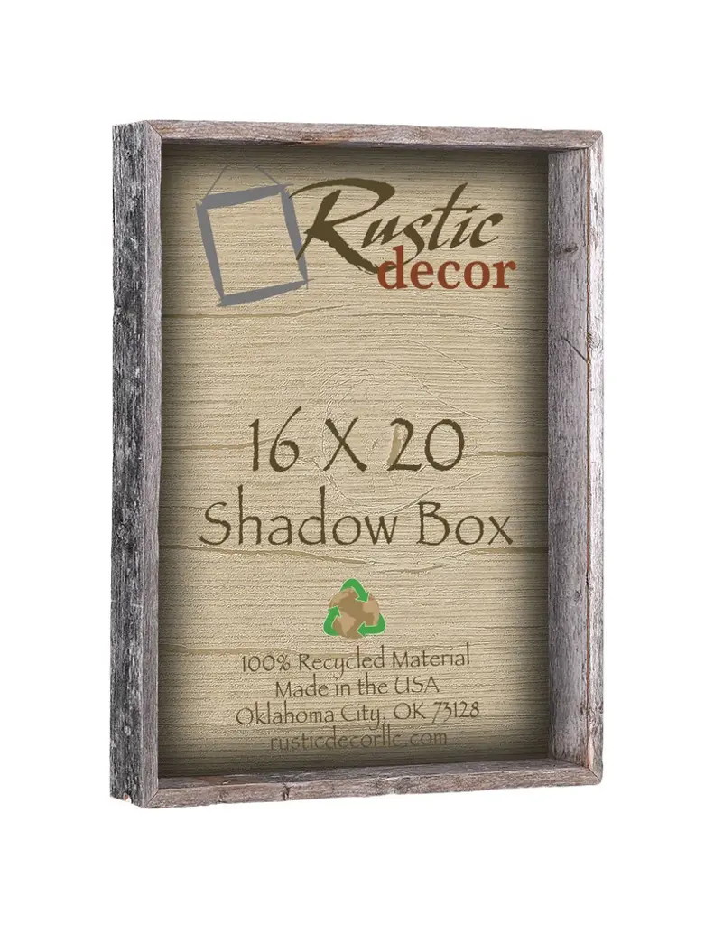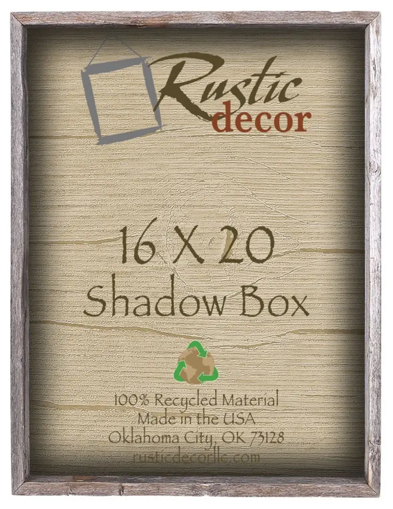 This 16-inch by 20-inch shadow box is manufactured from 100% authentic weathered wood allowing the rustic charm of the natural knots, nail holes and color variations to show through. This box is natural in color and comes with plexiglass and back for holding all your treasures. The shadow box is approximately 2.75 inches deep and is designed for displaying small tokens or stubs rather than an entire 16-inch by 20-inch photo. All our shadow boxes are custom-made at the time of order and will vary slightly from the picture due to the nature of the wood. Made in the USA.Outside Dimensions: 17"x21"
