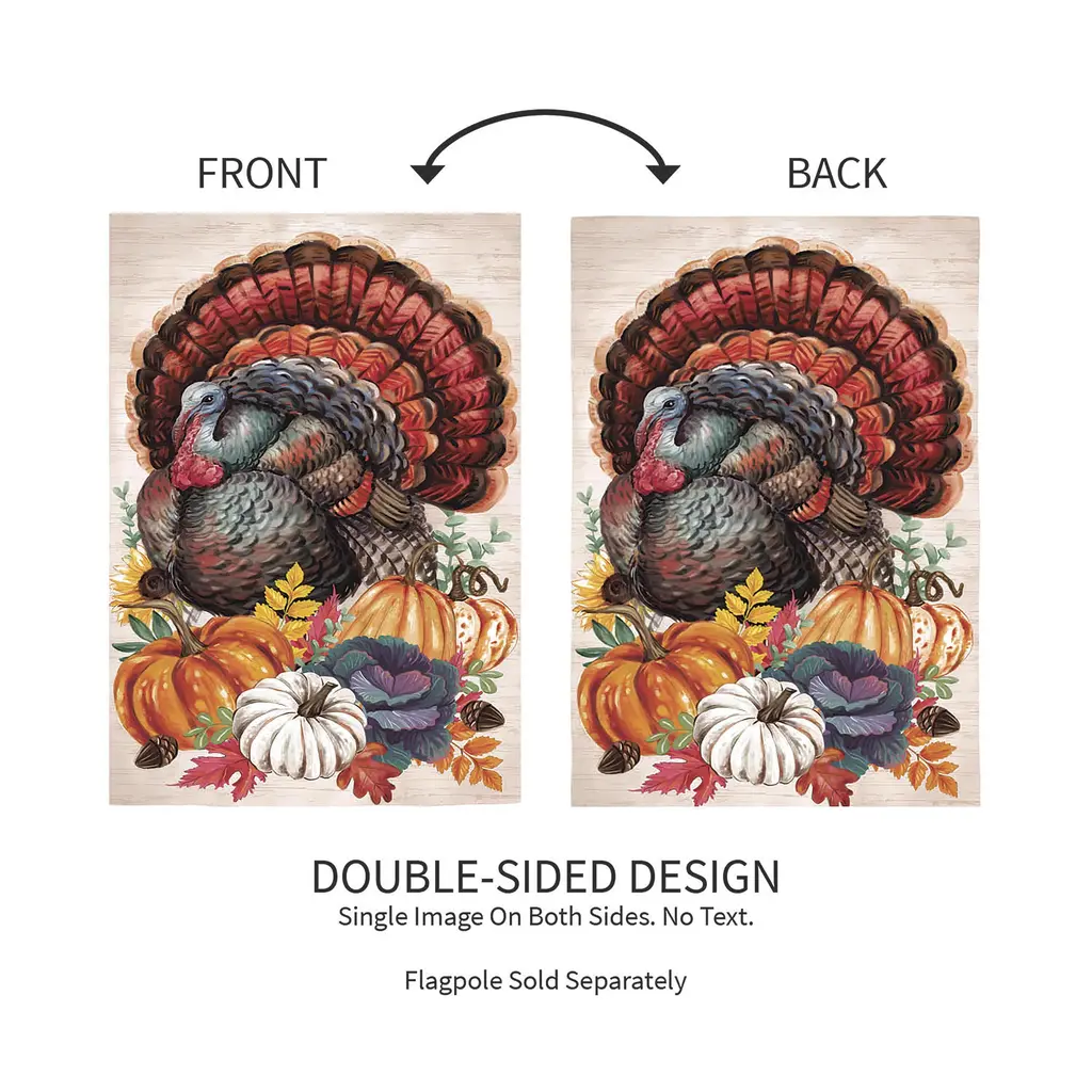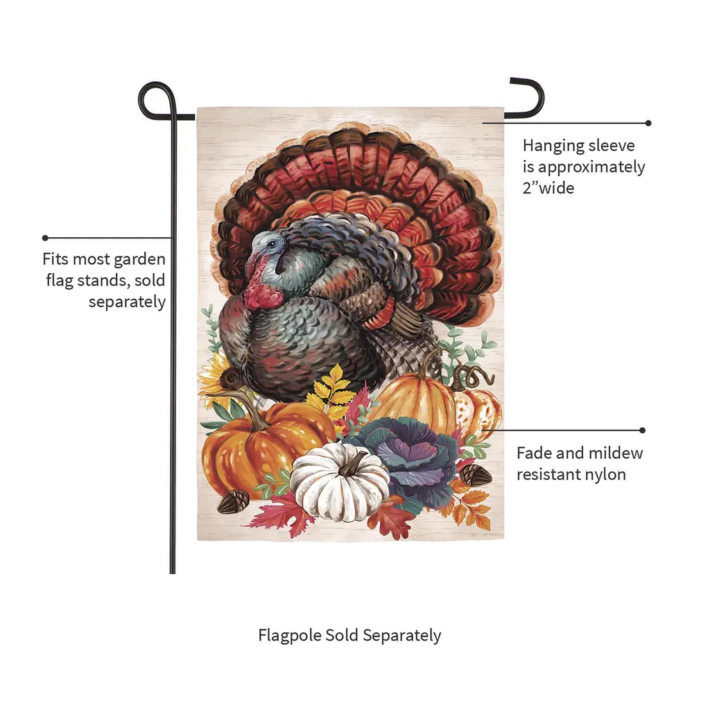 Welcome friends and family to the home with this applique garden flag. This flag features a magnificent turkey sitting in a pumpkin patch with sunflowers and leaves. Each Evergreen applique flag is carefully crafted from multiple layers of durable material that can withstand a variety of weather conditions. We combine pieces of fade-resistant, strong fabric with tight, detailed stitching to create a dimensional mosaic effect. Spot clean only, never put in a dryer. When not in use, flag can be hung in a closet or placed in storage container.