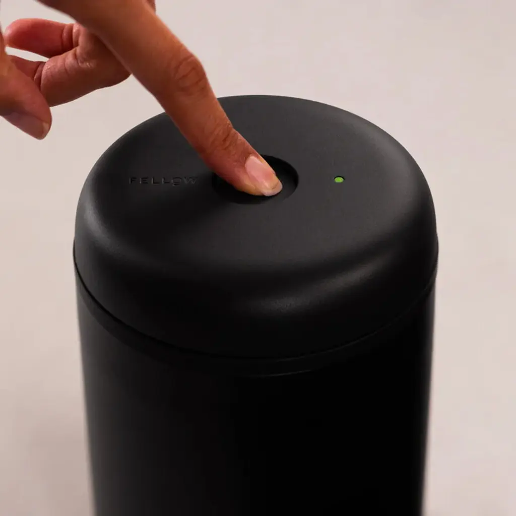 The Fellow Electric Atmos vacuum canister keeps your coffee beans fresh and aromatic for months. This sleek coffee jar features a black, airtight lid with an integrated vacuum pump that automatically removes air from the jar to maintain the optimal vacuum state for coffee bean storage. Powered by a rechargeable battery, the Electric Atmos vacuum canister operates with a simple push of a button, while the LED light on the lid indicates the current vacuum state and battery level. The vacuum jar is rechargeable via a USB-C cable. The battery lasts about four months with daily use, ensuring your coffee beans stay freshly roasted even during longer vacations. The capacity of this jar is 0.7 liters, which means it can hold approximately 11.11 oz (315 g) or 11,1 oz of coffee beans.