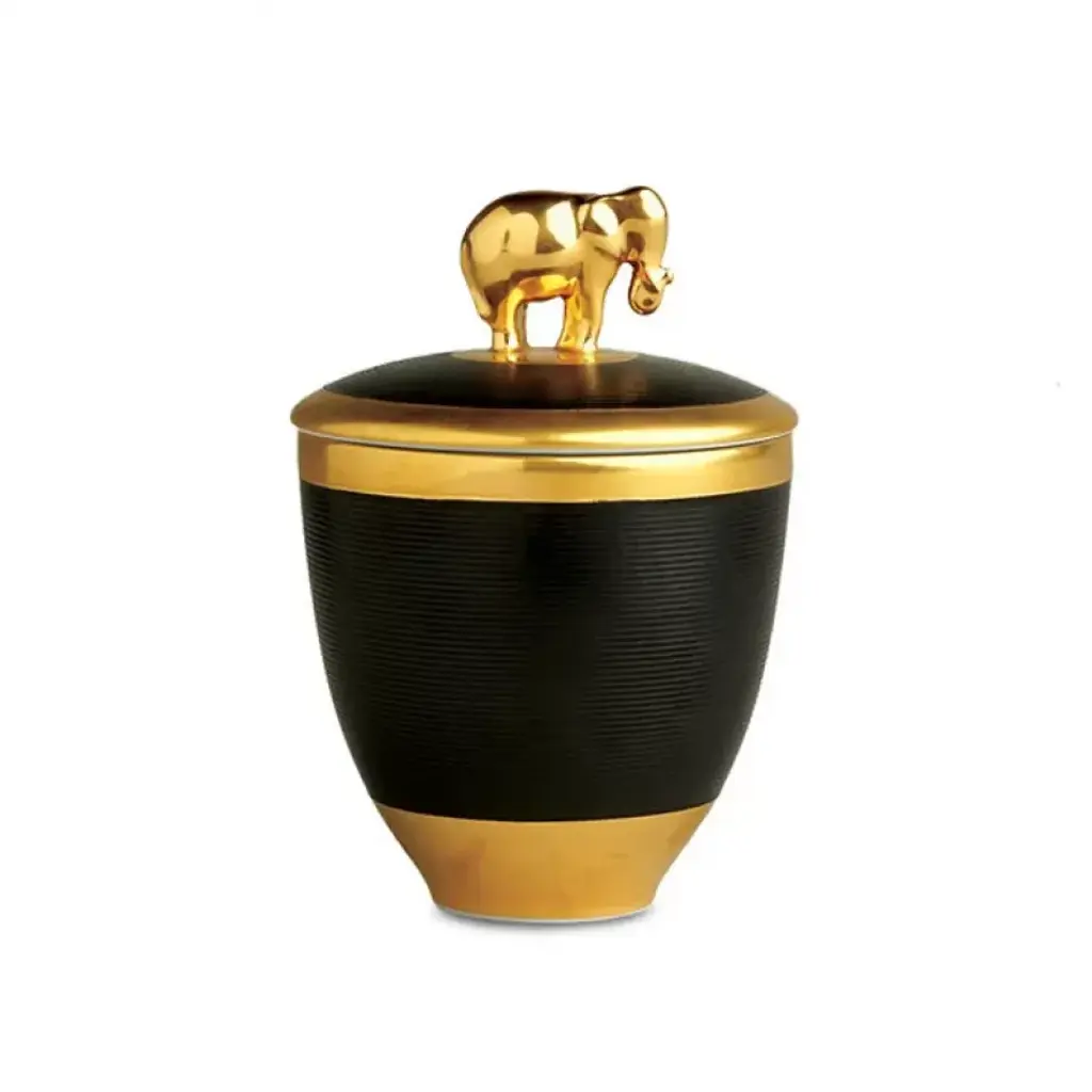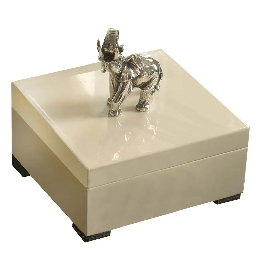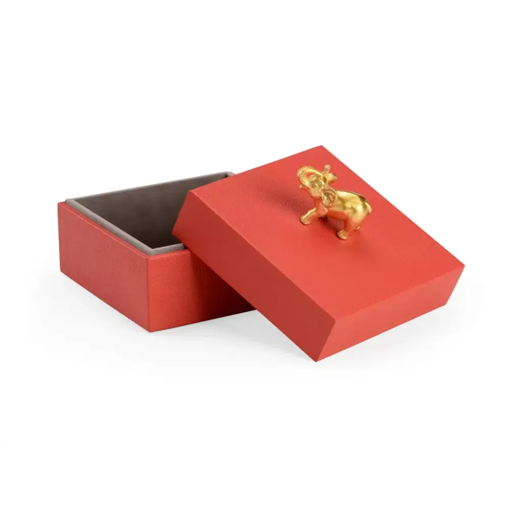 Felt Lined Wooden Box Covered In Faux Red Leather With a Metallic Gold Elephant Accent Handle.