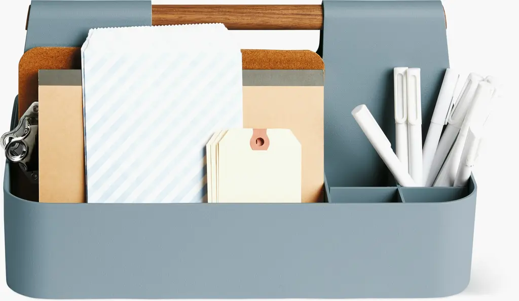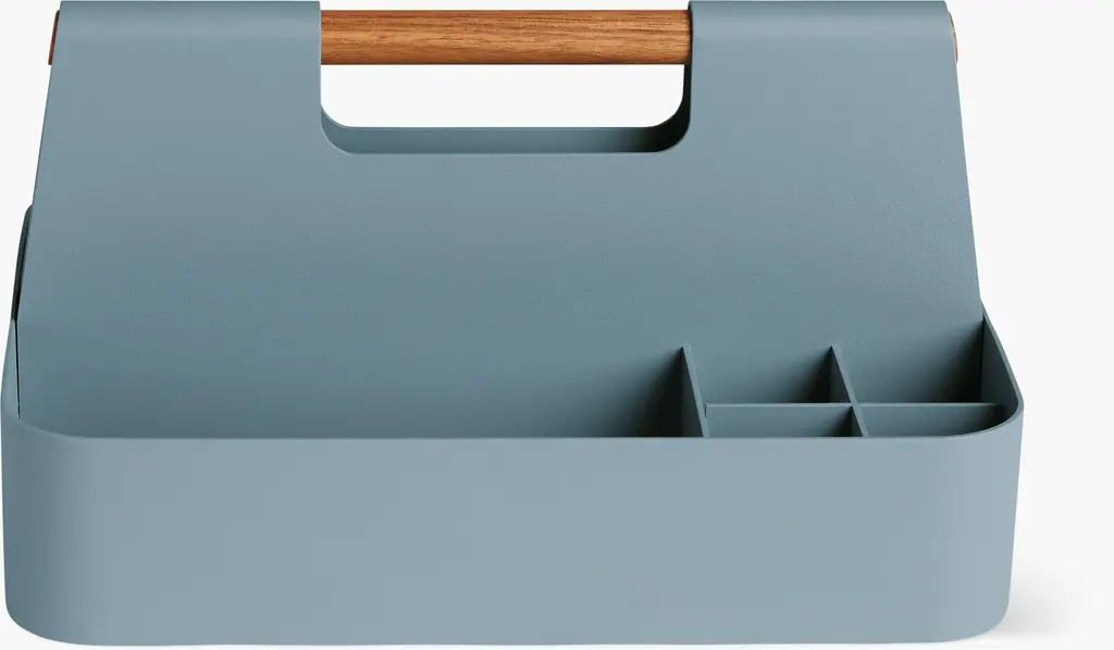 The Elin Toolbox (2017) is constructed of durable powder-coated aluminum with integrated compartment dividers for holding all sorts of items. A solid walnut handle provides tactile warmth.